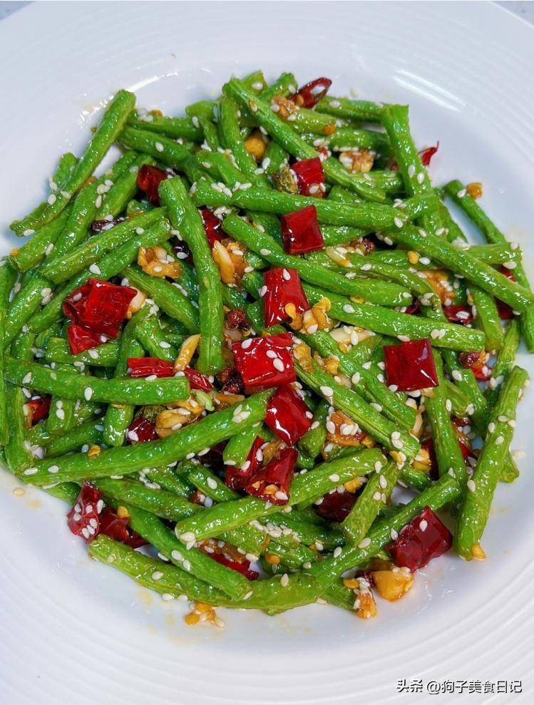 2、起锅烧水,水开后加入少许盐,放入四季豆,焯水2-3分钟,至颜色翠绿并稍微软身,捞出过凉水,沥干备用。