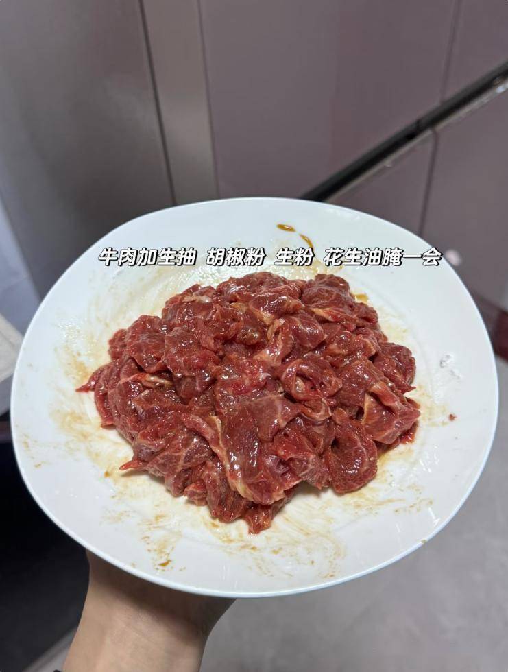 3. 锅中热油,放入生姜、大蒜爆香,加入肉丝翻炒至变色。