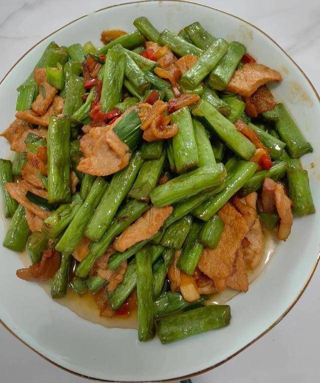 准备食材:四季豆、猪肉、干辣椒、蒜、葱、生姜。