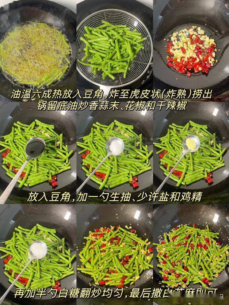 4、放入焯好的四季豆,大火翻炒均匀,加入1勺生抽、半勺蚝油、少许盐、1勺鸡精,继续翻炒至调味汁均匀裹在食材上。