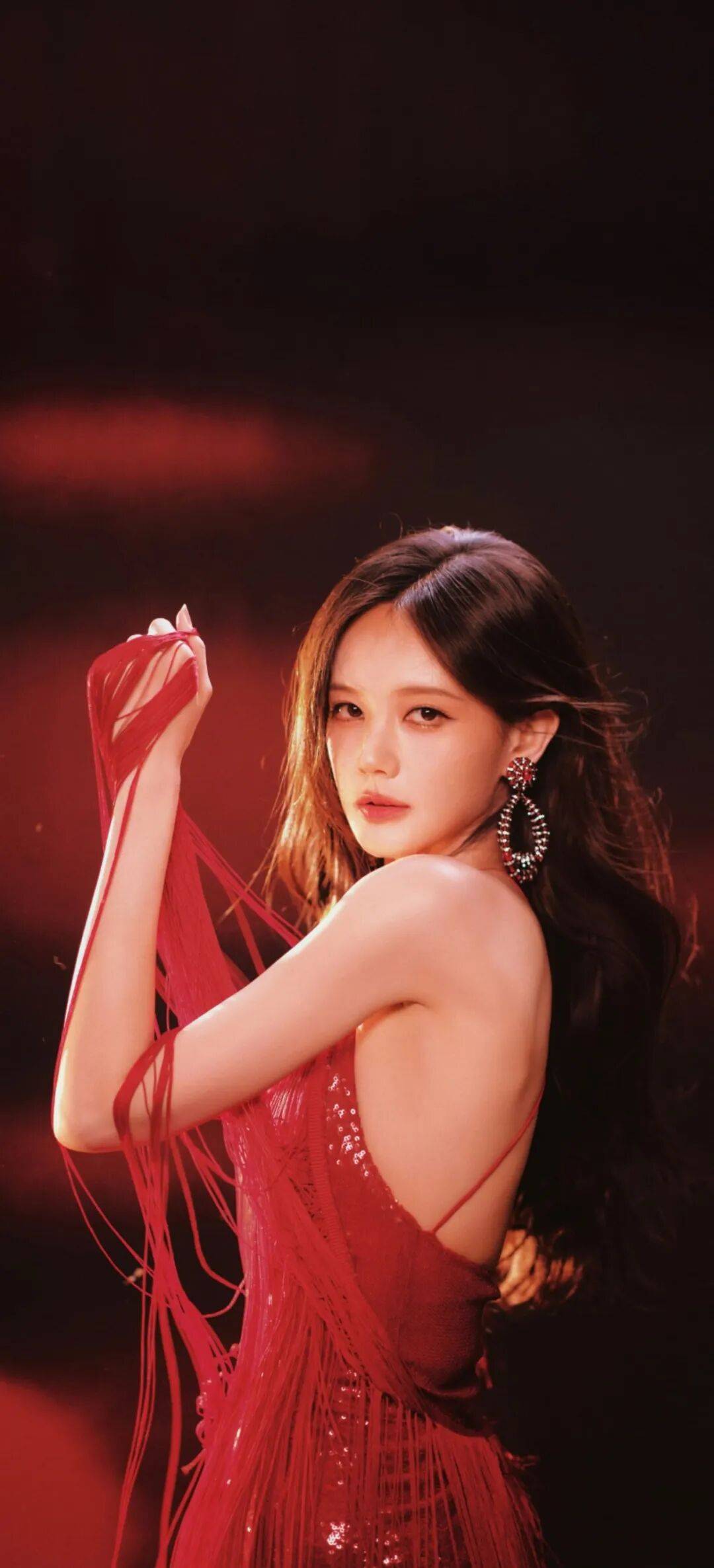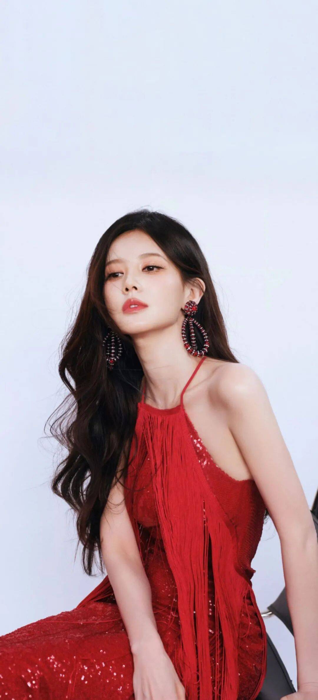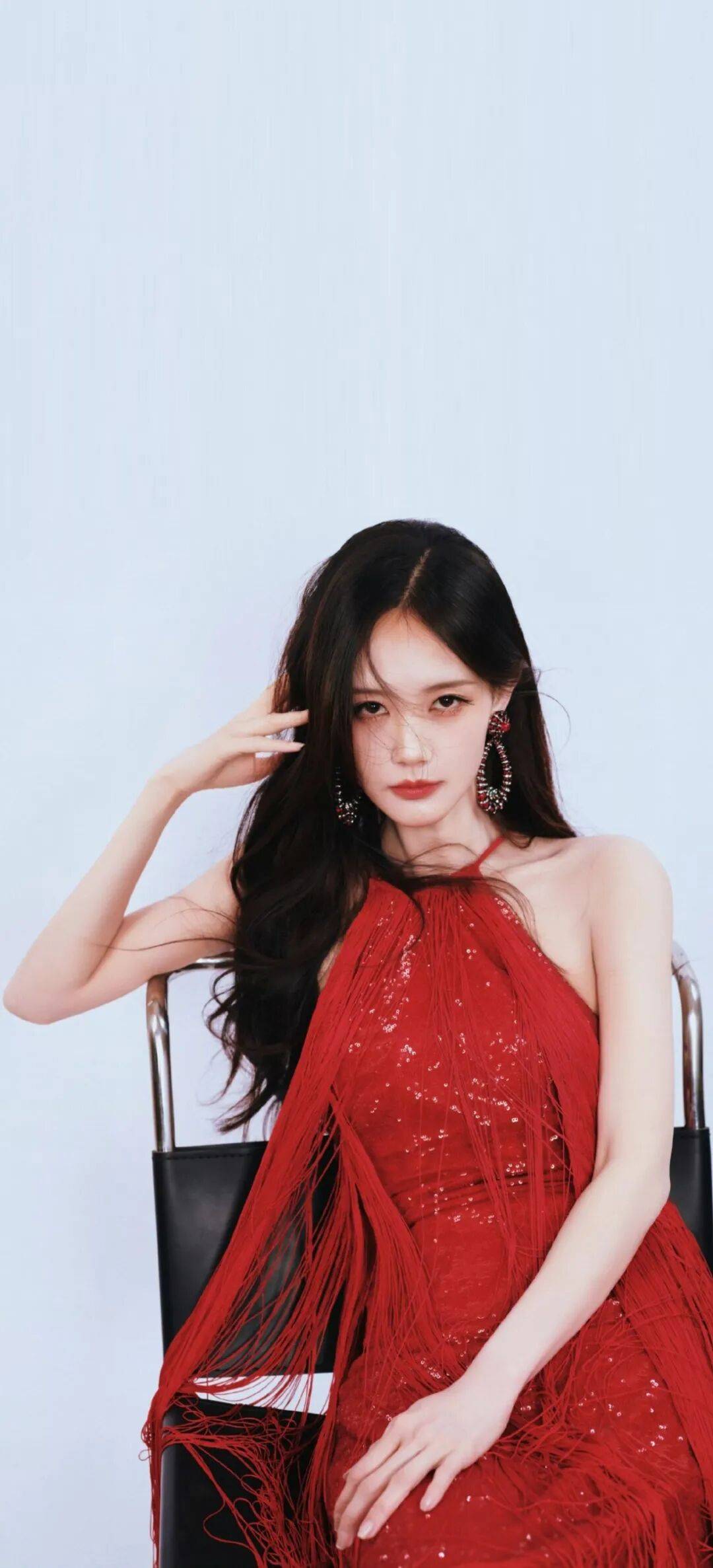 先说这套挂脖流苏裙,简直是把星光穿在了身上!正红色的裙身缀满细闪,走动时流苏跟着晃成一片红色瀑布,尤其是她坐在椅子上抬手拨头发的瞬间,黑色长卷发和红色流苏缠在一起,又纯又欲。最妙的是她戴的耳环,红色水钻和黑色珠链缠绕成圆环,和裙子的流苏遥相呼应,连指尖的红色指甲油都透着精致。