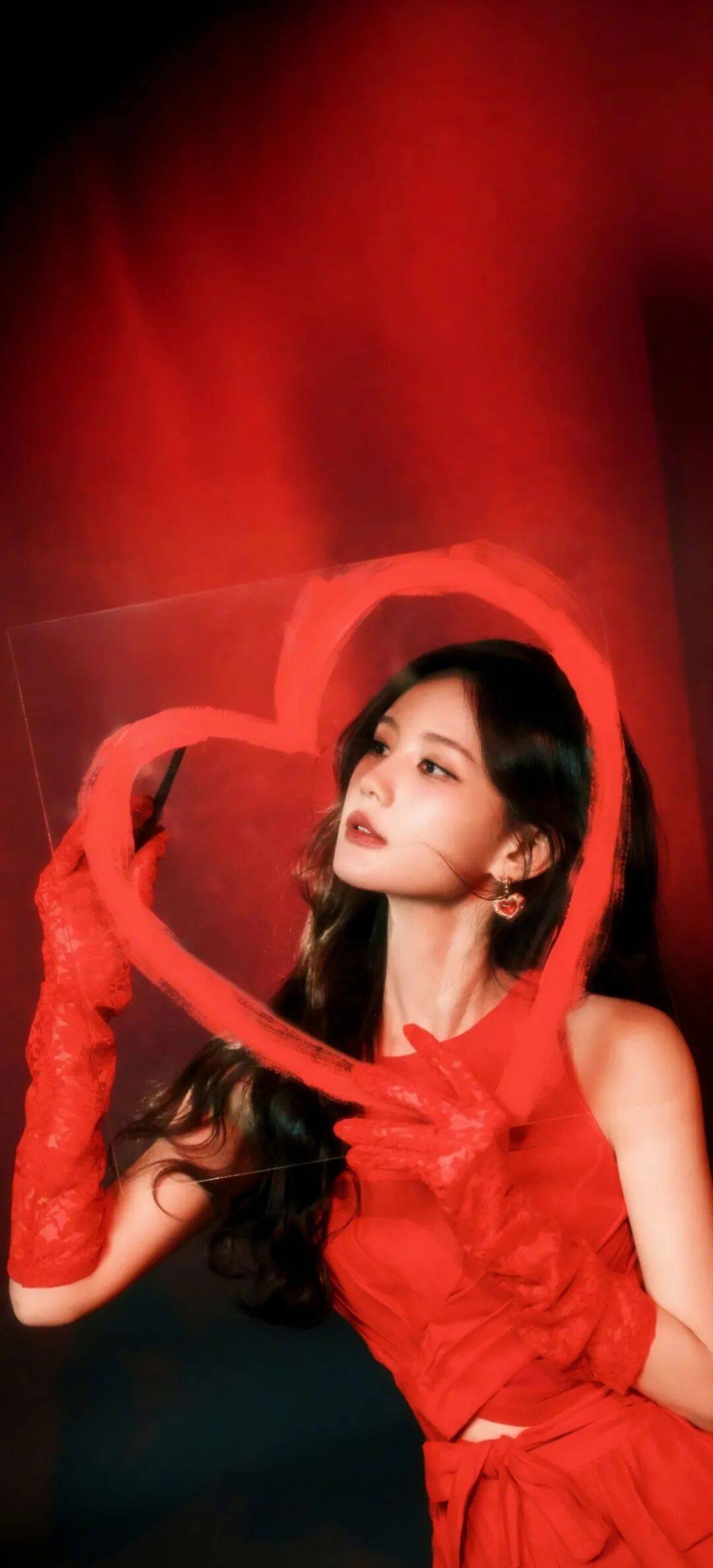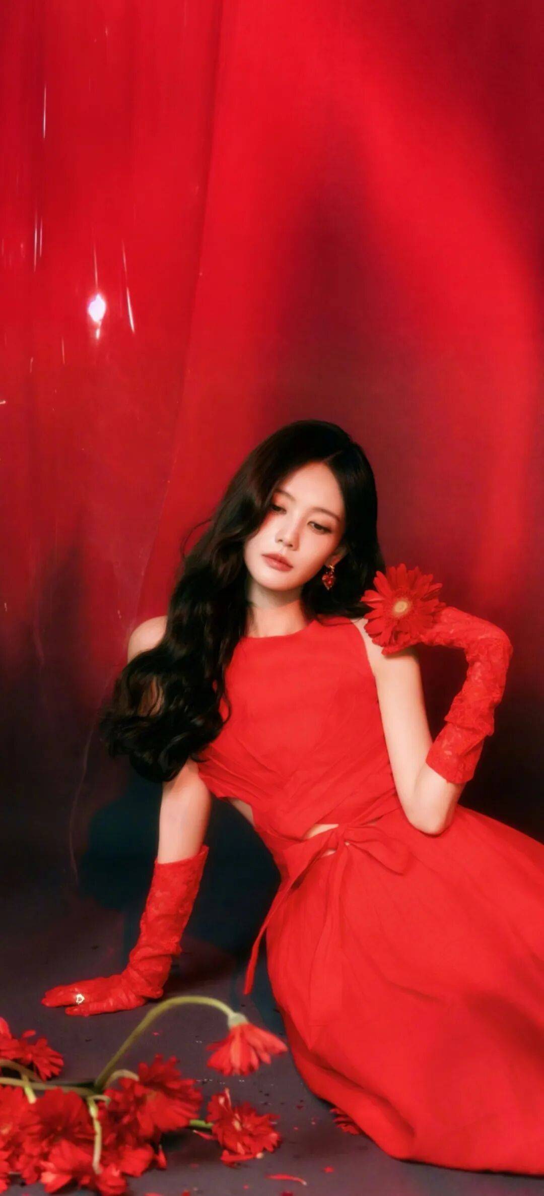 最让人惊艳的是她躺在红色背景前的样子!一身正红色缎面长裙,戴着同色系蕾丝手套,手里拿着朵红雏菊,周围散落着花瓣,像极了童话里的红皇后。她微微眯着眼,嘴角带着点狡黠的笑意,手套上的蕾丝花纹和裙子的蝴蝶结细节都透着复古宫廷风。当她举起那个红色心形道具时,突然又变回甜美的样子,眼神里的灵气藏都藏不住。