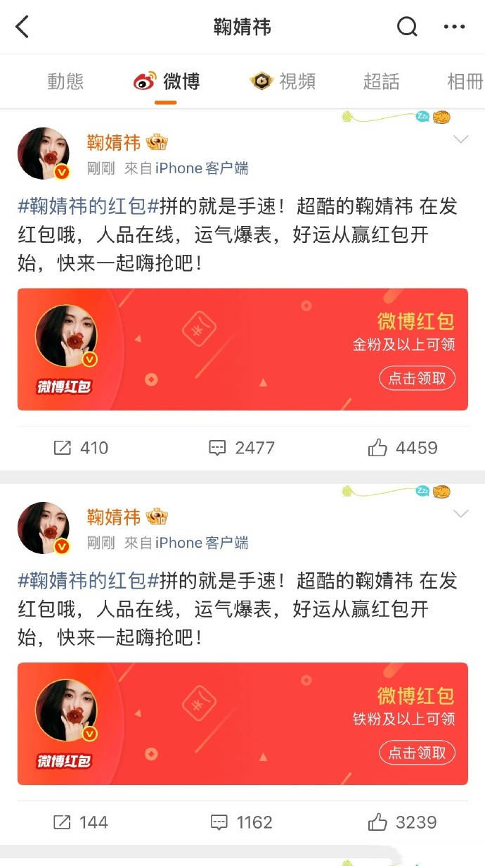 除夕这天,娱乐圈突然炸出一声惊雷——鞠婧祎,这位被粉丝爱称为"鞠姐"的个体户艺人,一声不吭地往微博扔了四个红包,总额整整20万!要说这红包发得有多"不讲武德"?四个字:毫无预告。别的明星发红包恨不得提前三天发海报、搞倒计时、拉横幅让全网关注,鞠姐倒好,闷声干大事,连个标点符号的预告都没有。四个红包,每个都顶到平台单笔上限49999.9元,两分钟之内被抢得渣都不剩。这手速,这网速,建议没抢到的朋友直接报警,就说有人"抢劫"了你的年终奖。更绝的是,她还设置了领取门槛——三笔限定"金粉及以上",一笔放宽到"铁粉及以上"。