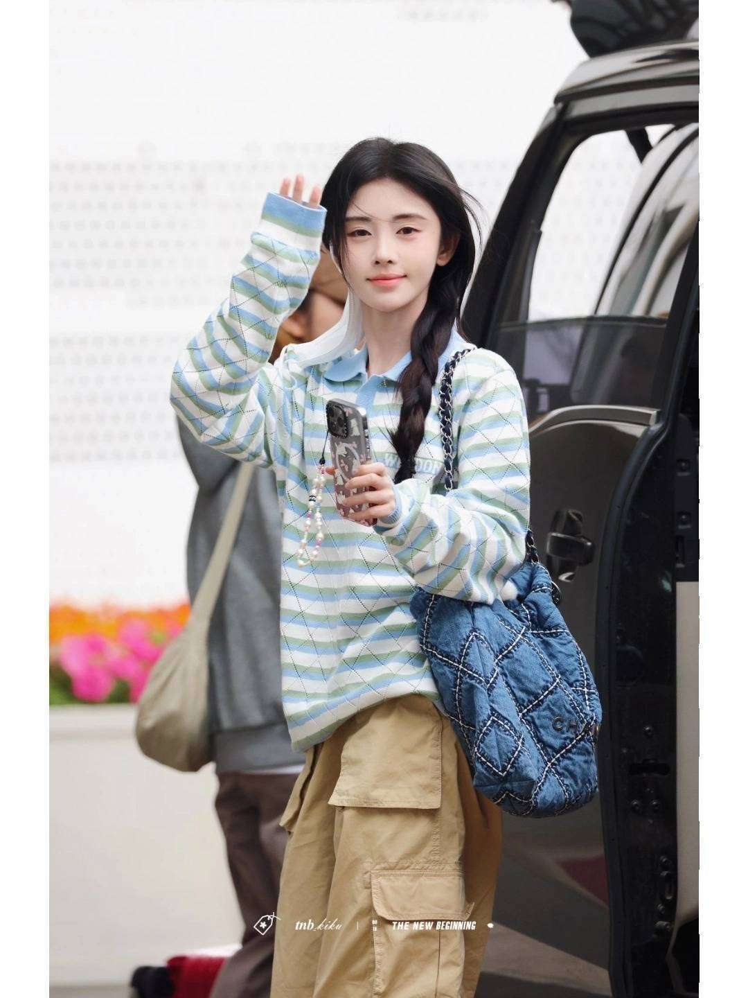 私 服街拍里的她堪称混搭高手。简单的牛仔外套配碎花裙,偏要用金属腰链束出蚂蚁腰,转身时发梢染的薄藤紫在阳光下若隐若现。这种"甜酷风"的精准把控,让每个机场造型都引发淘宝同款搜索狂潮。