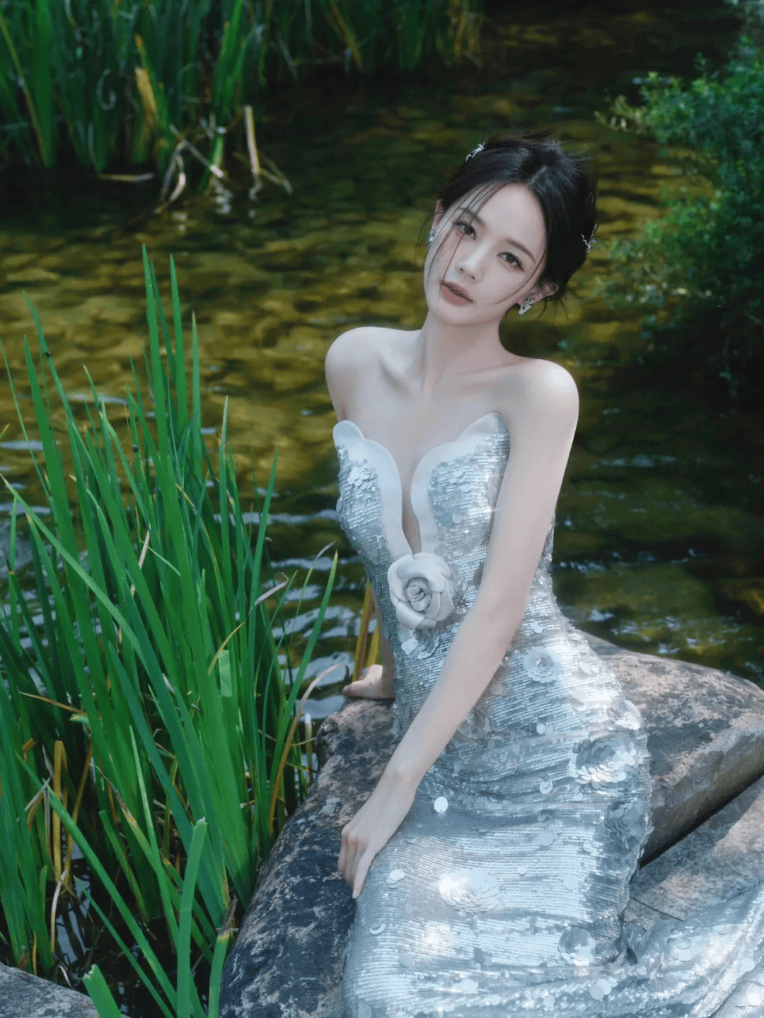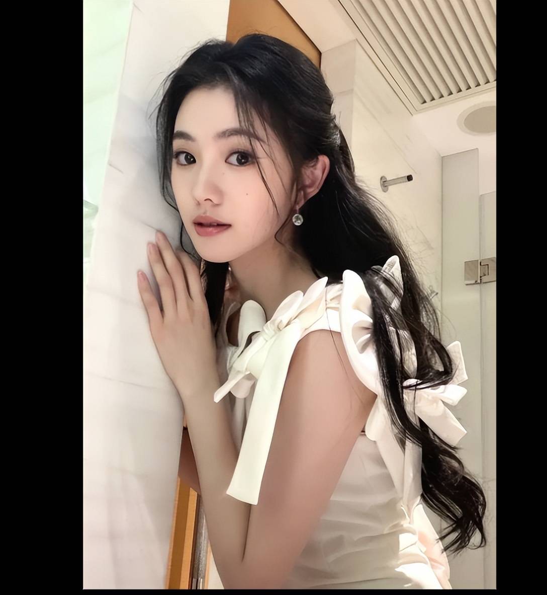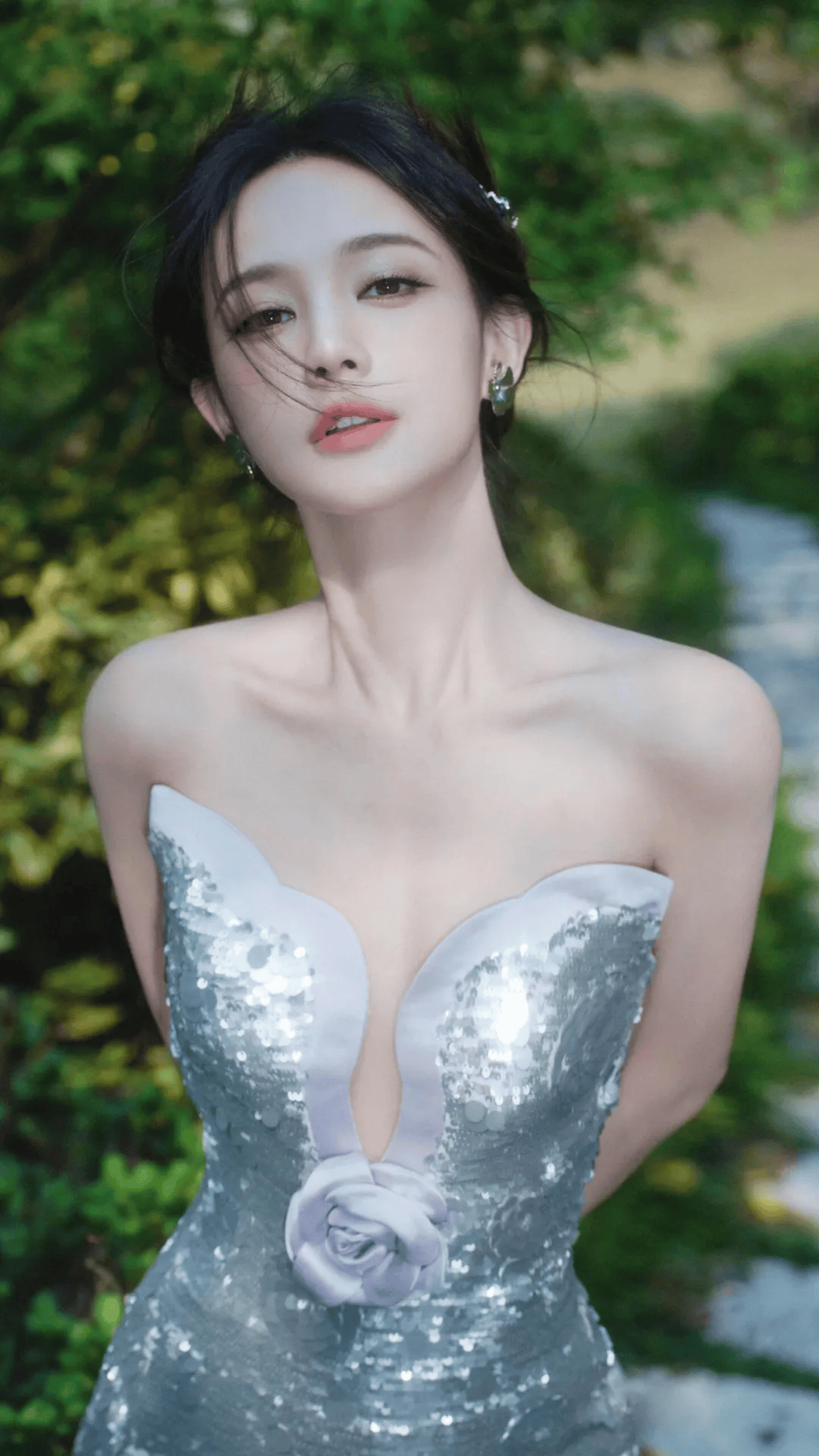 最绝的是她的发型,乌黑的长发被风吹得微微散开,几缕碎发贴在脸颊旁,发间别着银色的雪花发饰,跟裙子的颜色完美呼应。她的耳朵上戴着水滴形的钻石耳坠,在阳光下闪得像星星,脖子上虽然没戴项链,但精致的锁骨线条已经足够吸睛。