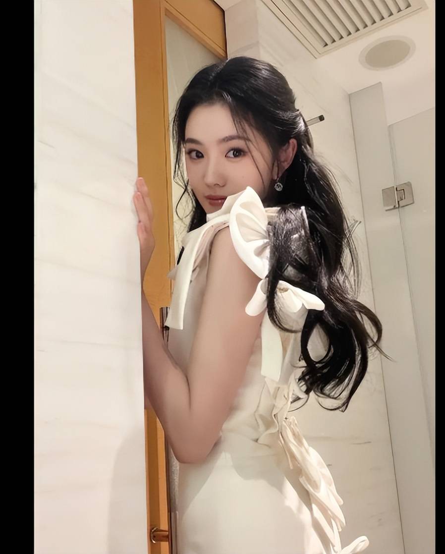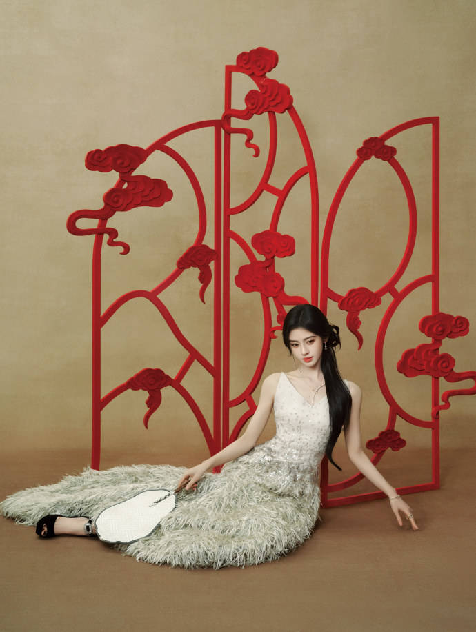 风格融合,将东方温婉与现代时尚结合在一起。裙装采取西式剪裁和元素(亮片、羽毛)是现代时尚的代表。在演绎时,鞠婧祎妆容干净清透,强调眉眼的神韵;发型是温婉的低马尾或盘发,露出光洁的额头和优美的下颌线。这种内敛、含蓄的美感,正是东方美学的核心。她没有用过于夸张的配饰去抢夺风头,而是让自身的气质与服装融为一体,展现出一种“人穿衣”而非“衣穿人”的高级感。