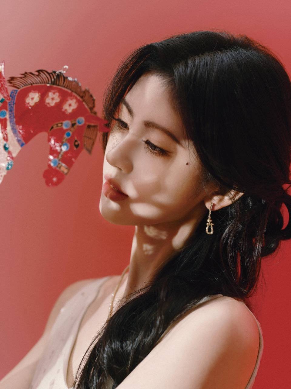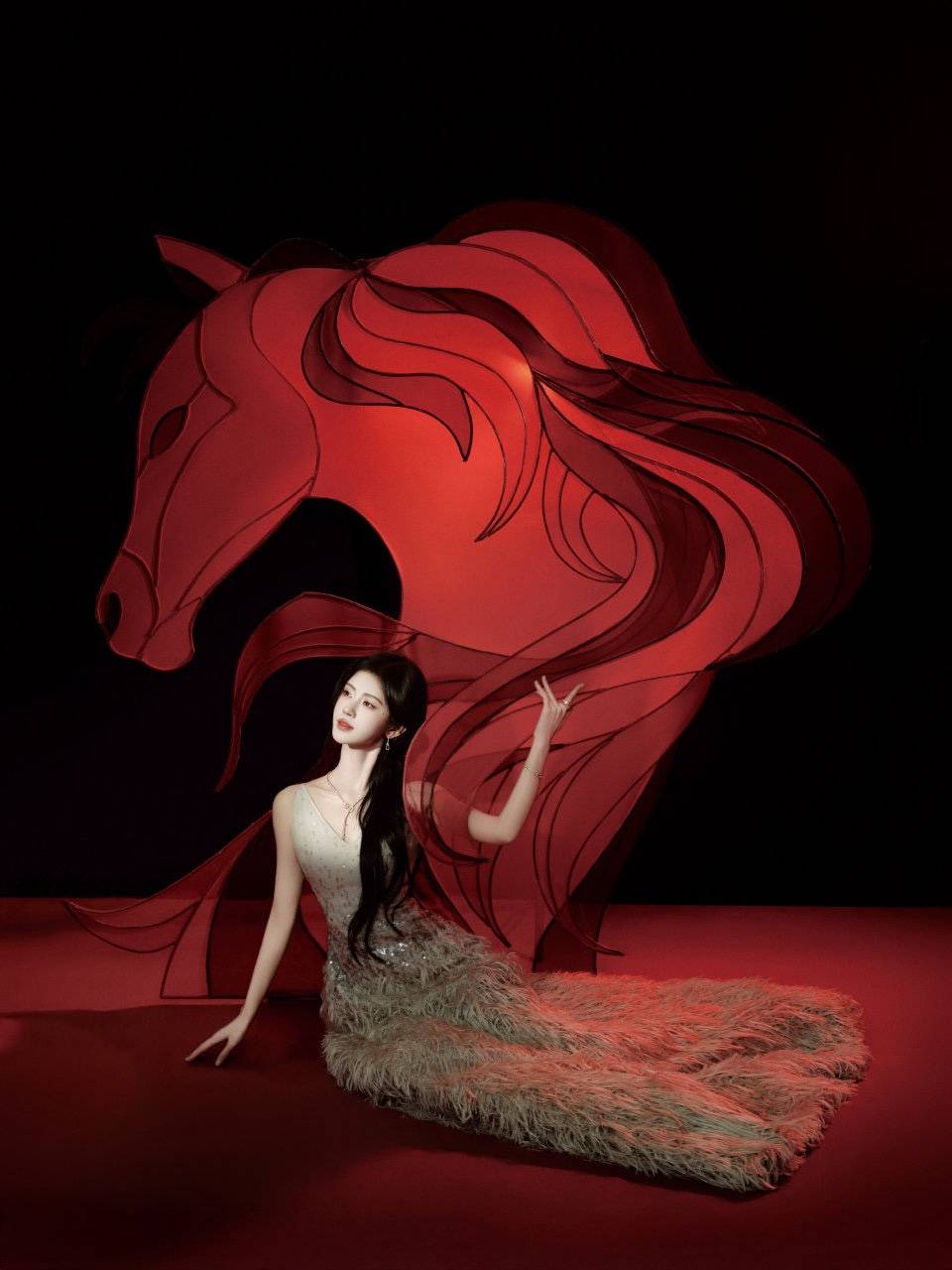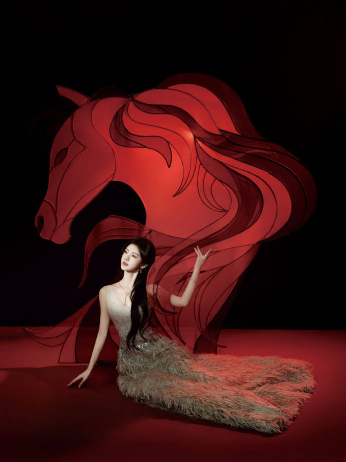 这款造型还有着马年的寓意,透着满满的节日氛围。那抹浓郁的中国红,与鞠婧祎身上浅色的羽毛裙形成了鲜明对比,不仅突出了人物主体,更让整个画面充满了喜庆祥和的春节气息。而骏马剪纸,不仅有着马到成功的寓意,也充满着故事感。