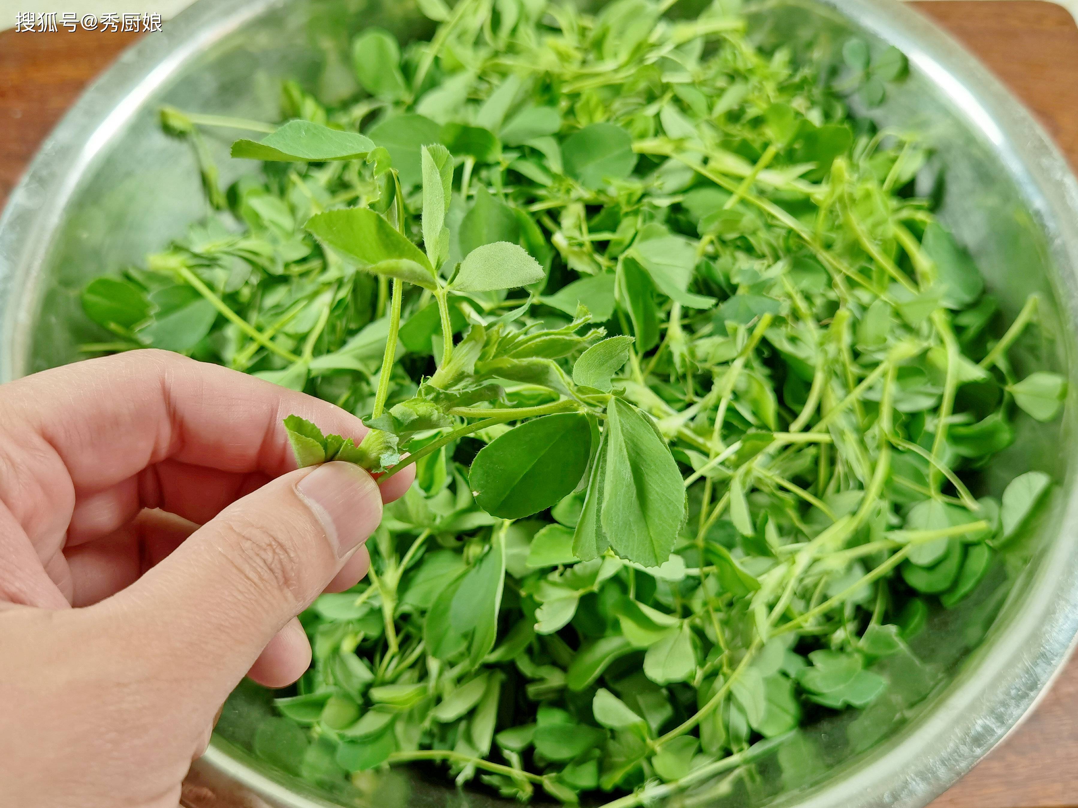 这道春天限定的美味,我每年这时候都会掐着时间吃。那天去菜市场,看见一堆大妈围着个竹筐抢菜,凑过去一看——嫩生生的苜蓿菜!那三片小叶翠绿饱满,水灵灵的,看着就馋人。赶紧挤进去抢了一大兜,回到家就开始琢磨怎么做。