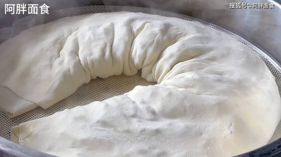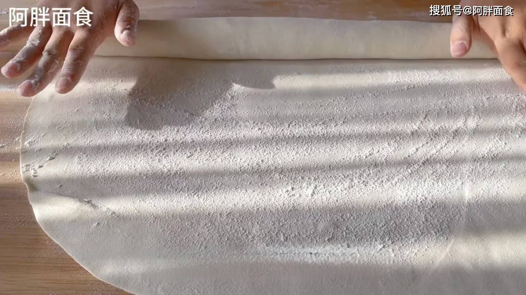 3、取出饧好的面团,直接擀开。用家中最长擀面杖,把面缠上去擀,这样省时省力,2分钟就能擀开。厚度1.5毫米左右。