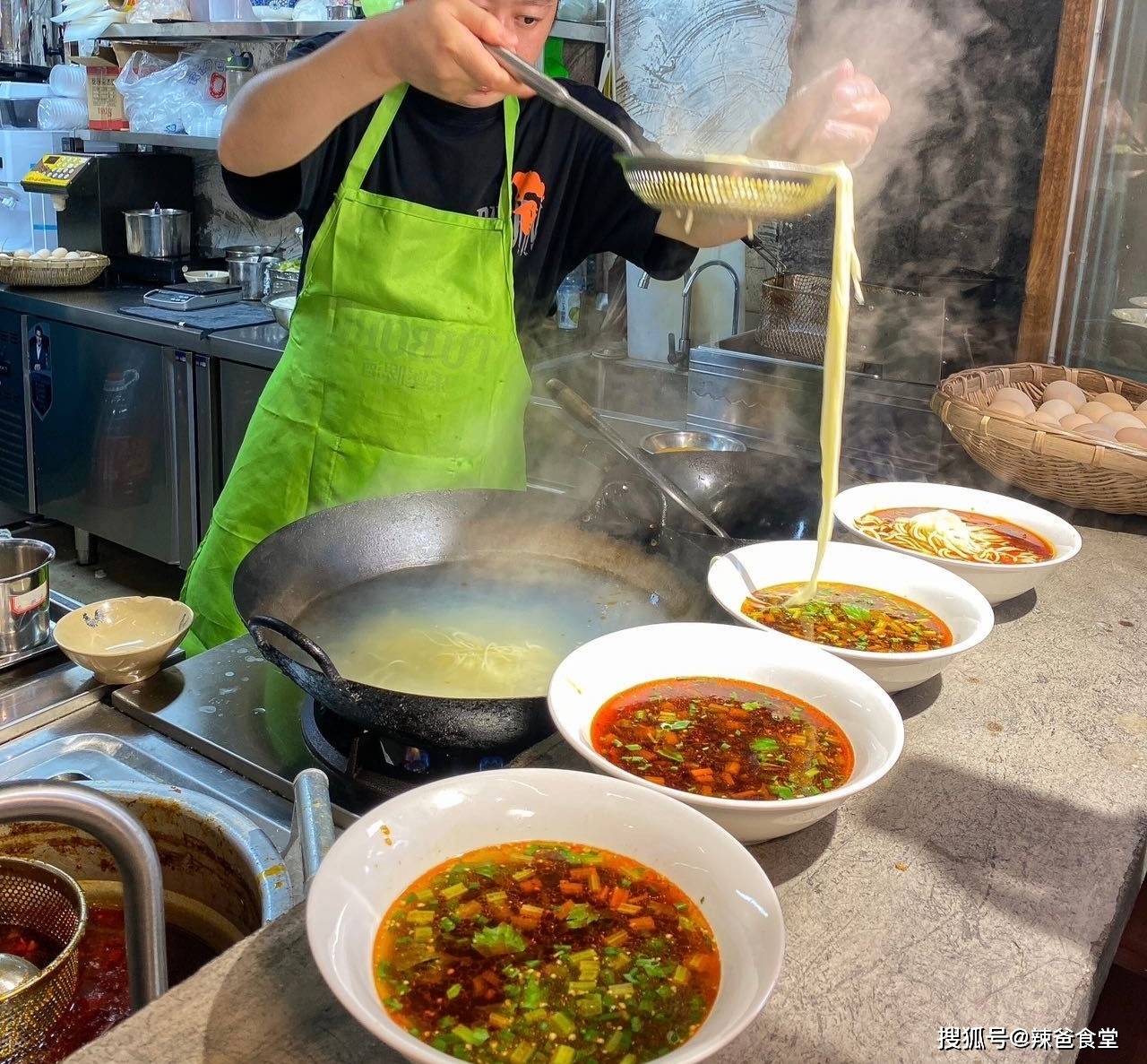 面是手工拉制的高筋面,能拉出毛细、二细、韭叶、大宽等八种粗细,现拉现煮,口感筋道有韧性。