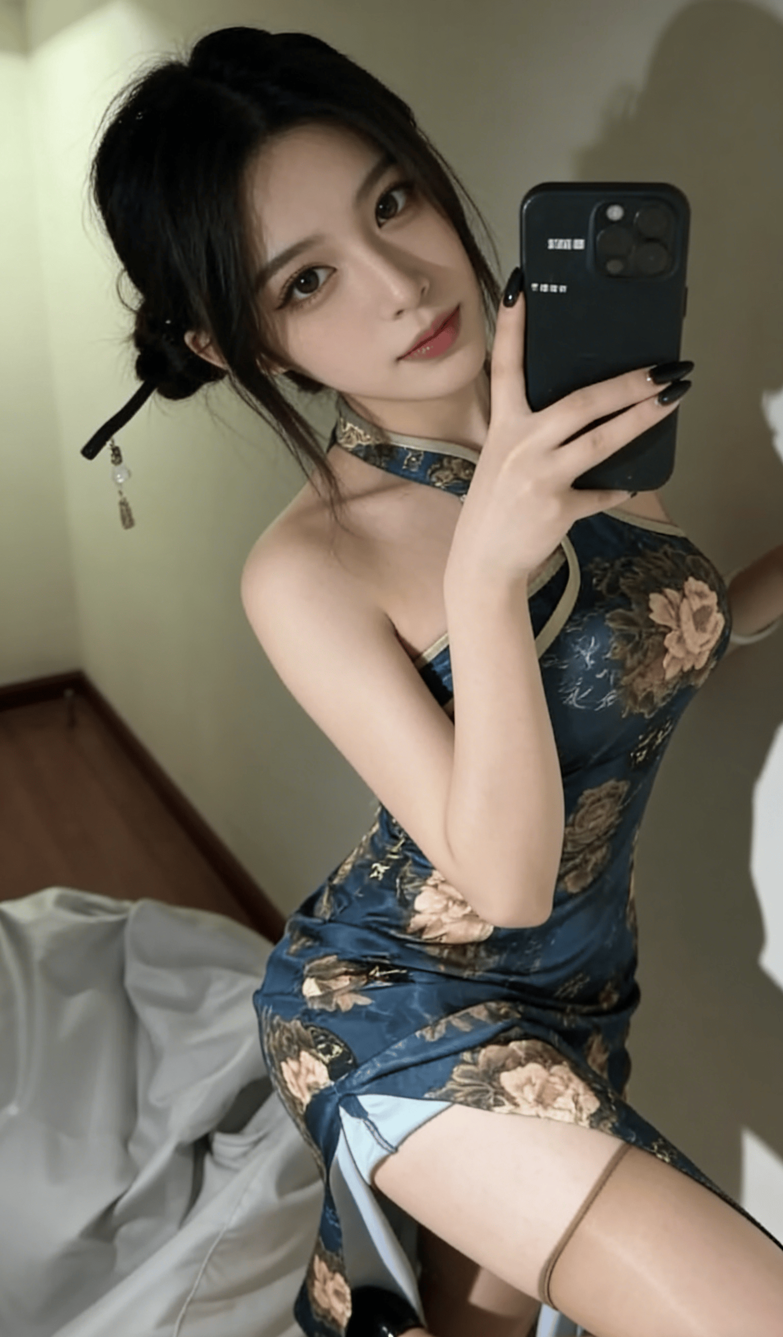 修身剪裁完美贴合腰臀曲线,将曼妙的身段尽数勾勒,高开叉的短款设计,大方展露一双笔直修长的美腿。肌肤在柔光下泛着细腻莹润的光泽,没有半分刻意的卖弄,却比千篇一律的露骨表达,更勾人无限遐想。脚下的黑色漆皮高跟鞋,衬得脚踝愈发纤细精致,给这份温婉的国风古韵,添了几分明艳张扬的御姐气场。