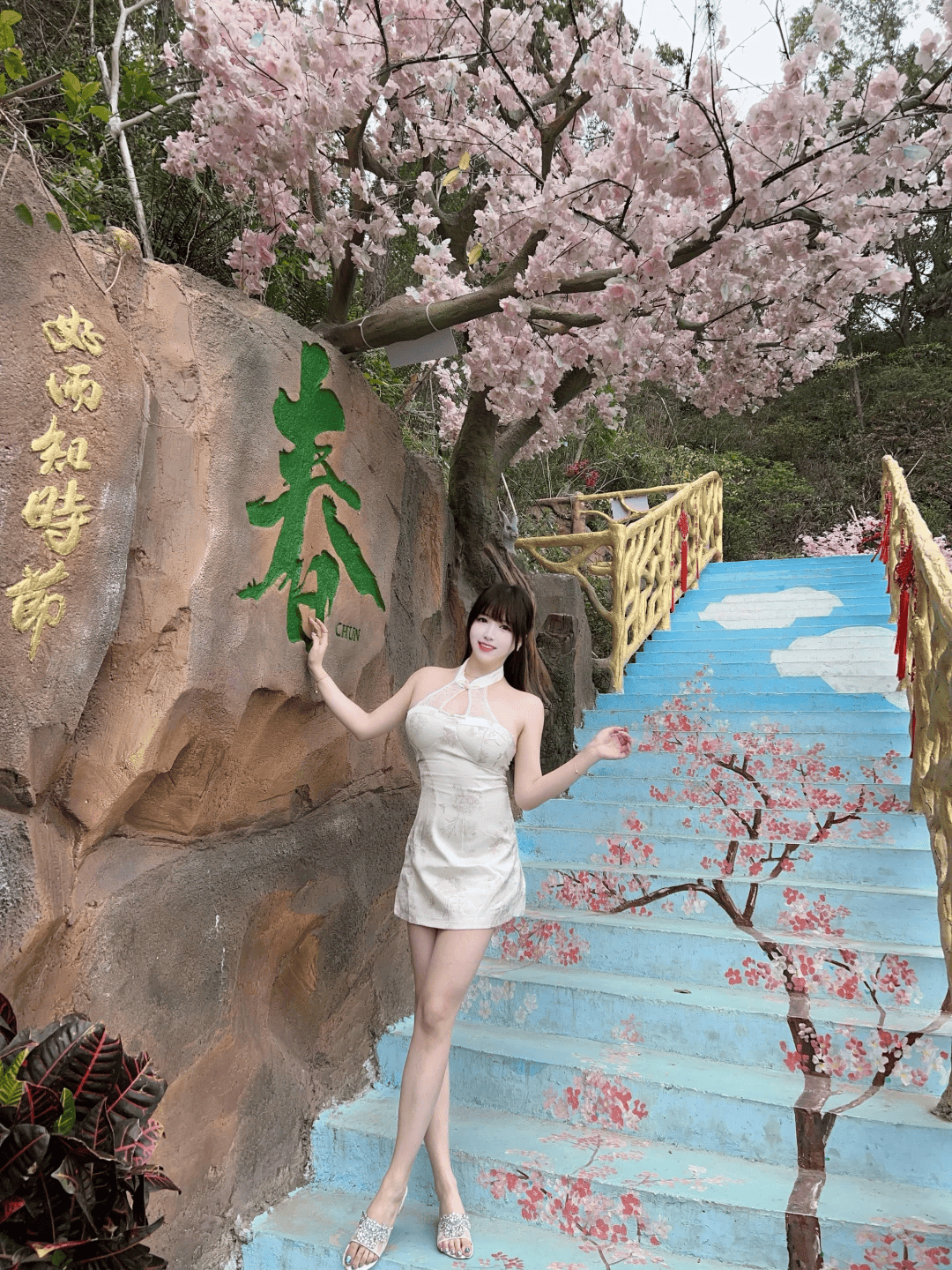 风把裙摆吹得扬起弧度,水钻凉拖敲在石阶上,发出细碎声响,像在和春天说:“我来了,带着好运和温柔。”