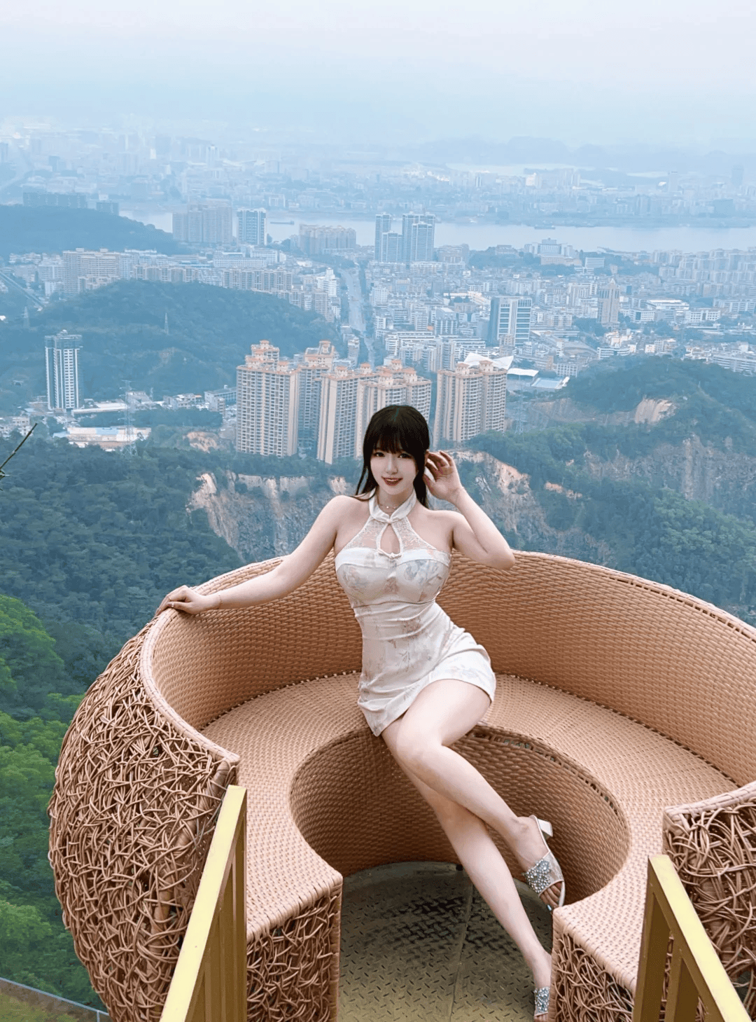 身上的米白挂脖旗袍裹着曲线,领口的镂空设计在风里轻轻晃,像把一整个春天的温柔都缝在了身上。