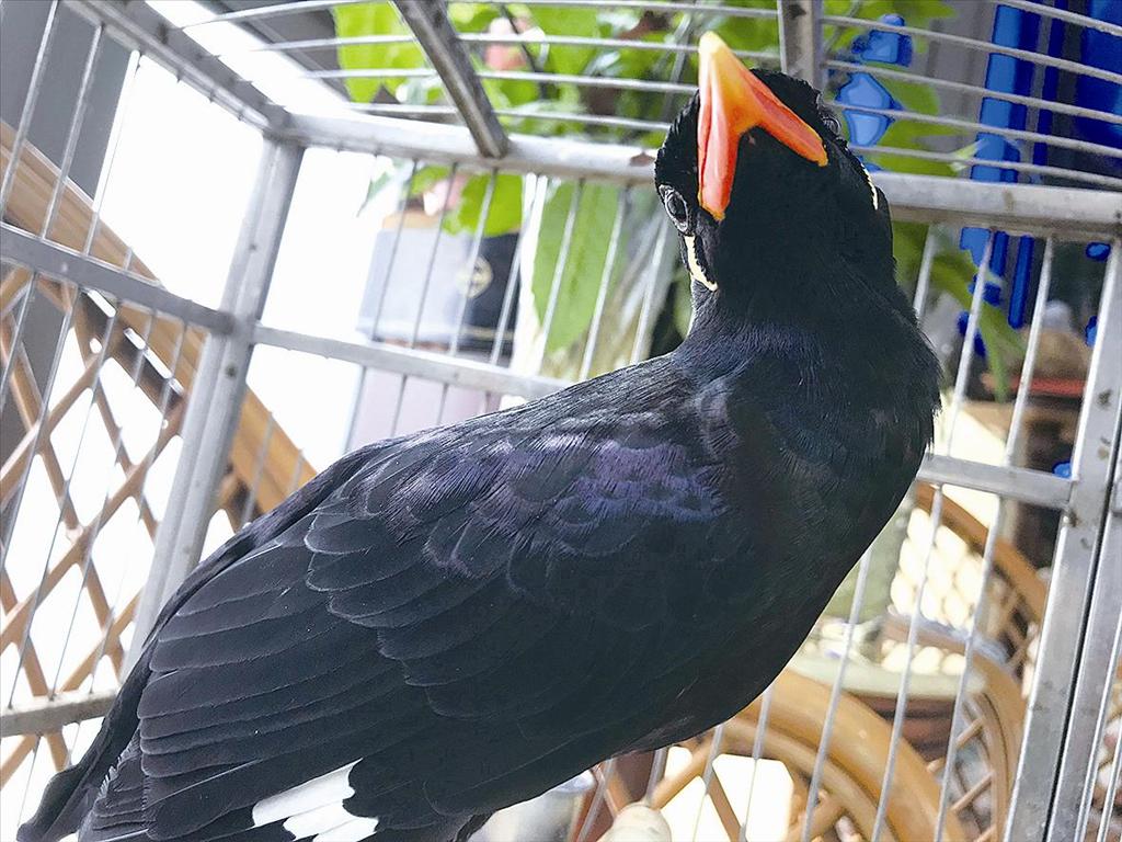 清理鸟笼的配合:这鹩哥很有灵性,每次清理鸟笼时它都很知趣地积极配合,仿佛知道这是为了它的健康着想。