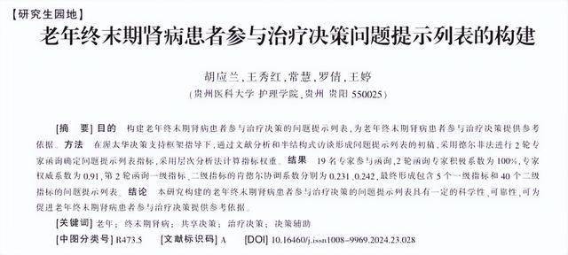 胡应兰.老年终末期肾病患者参与治疗决策问题提示列表的构建,护理学报,2024-12-10