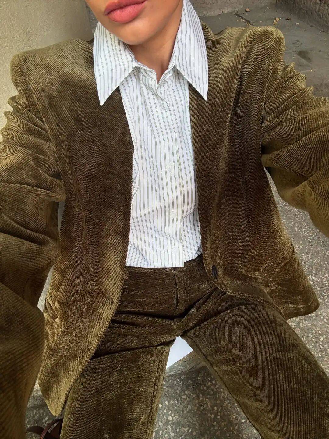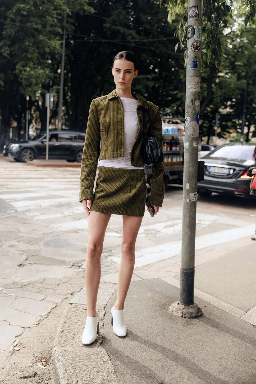今年秋冬强烈推荐大家试试绿色的灯芯绒单品,有风格又有辨识度。 刚去世的黛安·基顿(Diane Keaton)留下了很多经典穿搭,这一套灯芯绒套装让我印象深刻。一身暗色调的灯芯绒套装容易穿得闷,她直接用内搭的一点红点亮全身。▼
