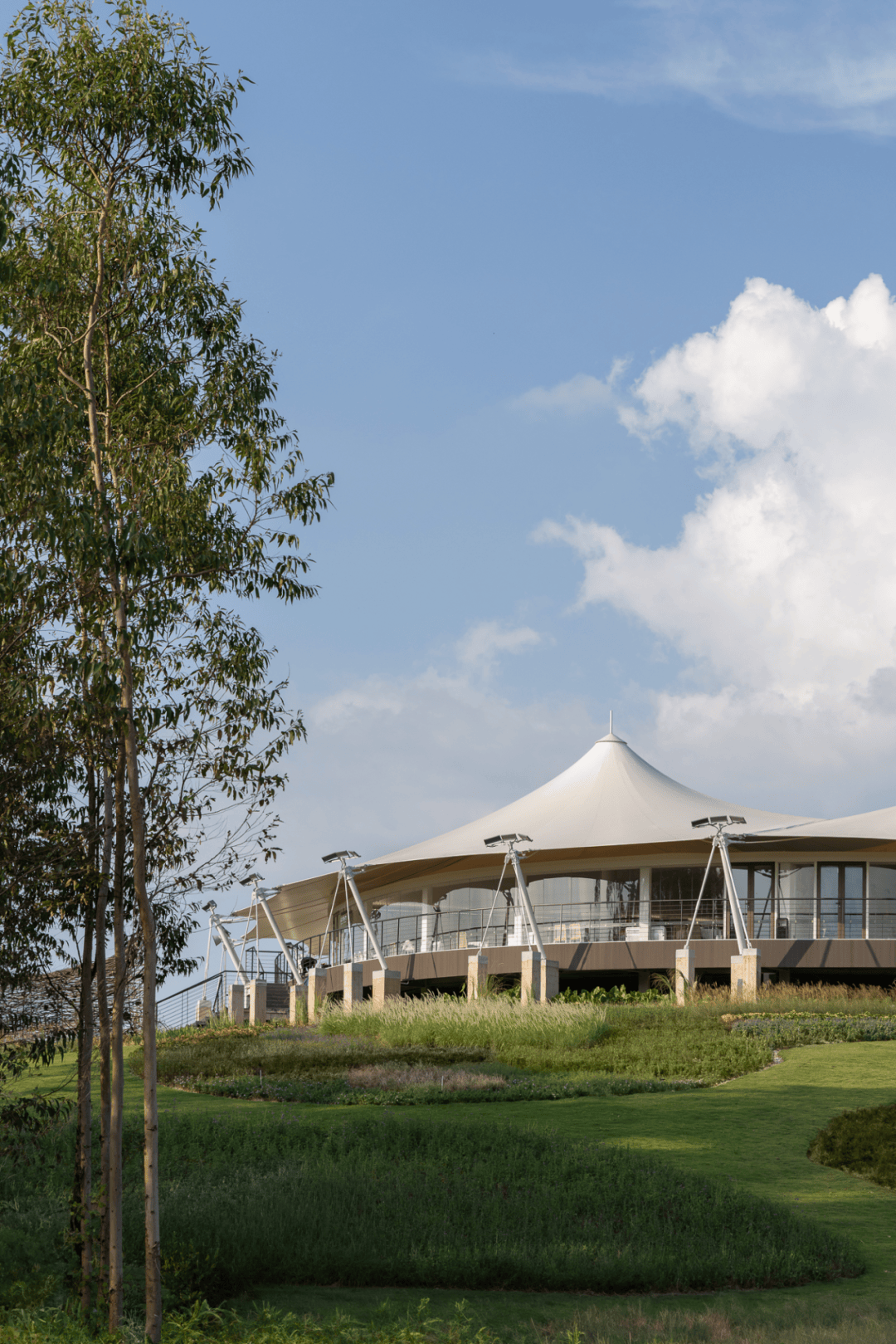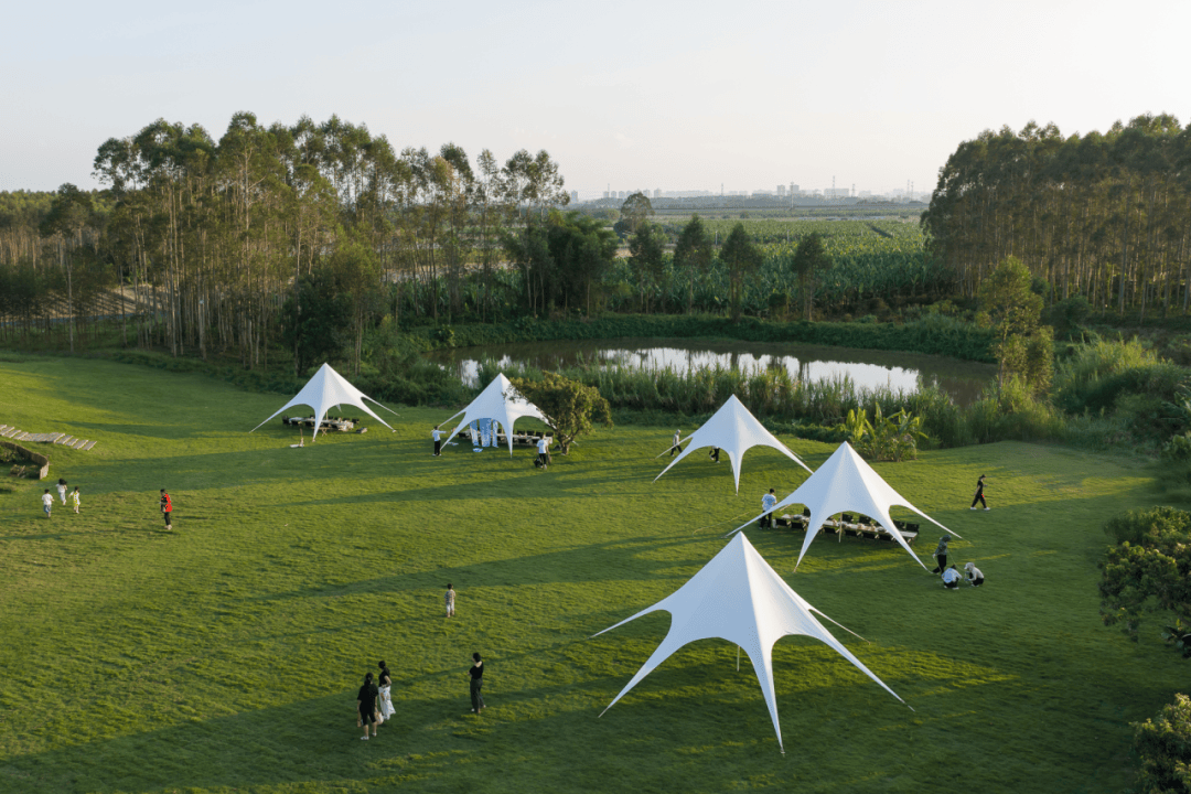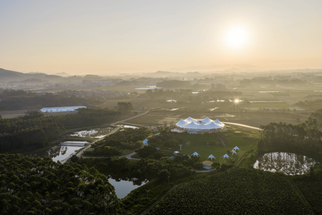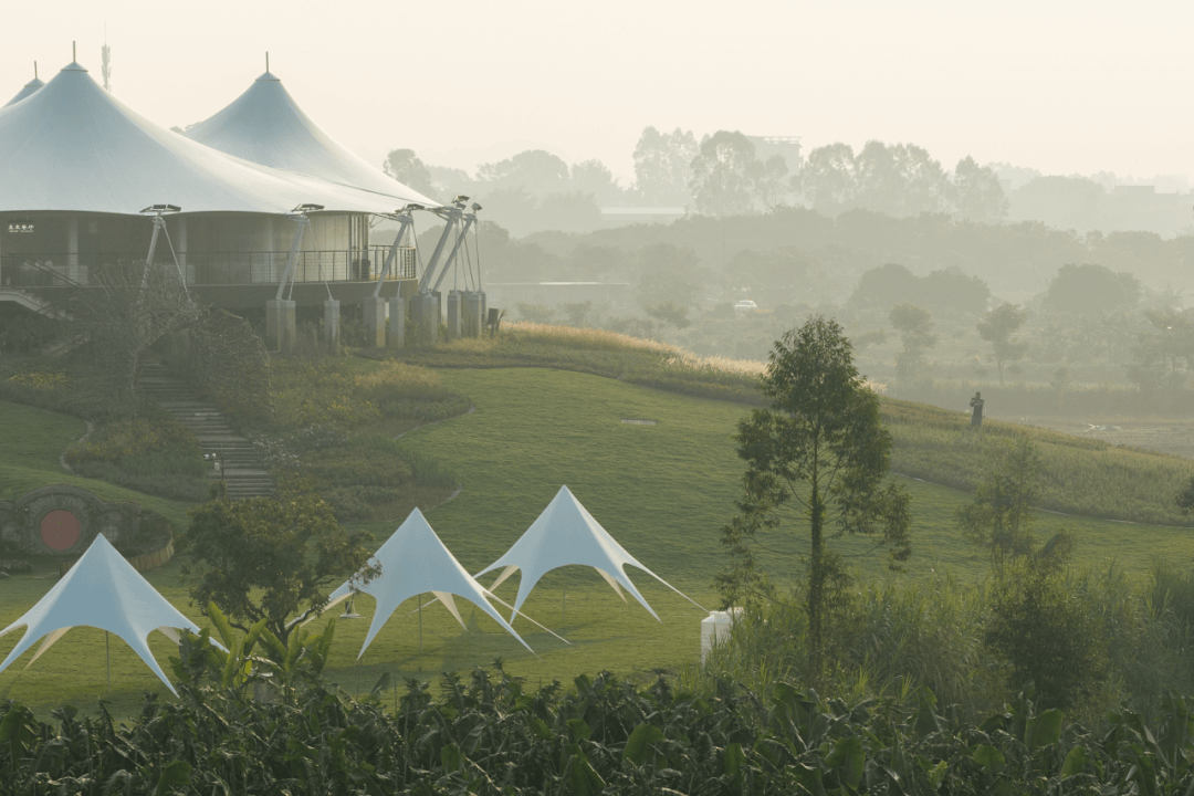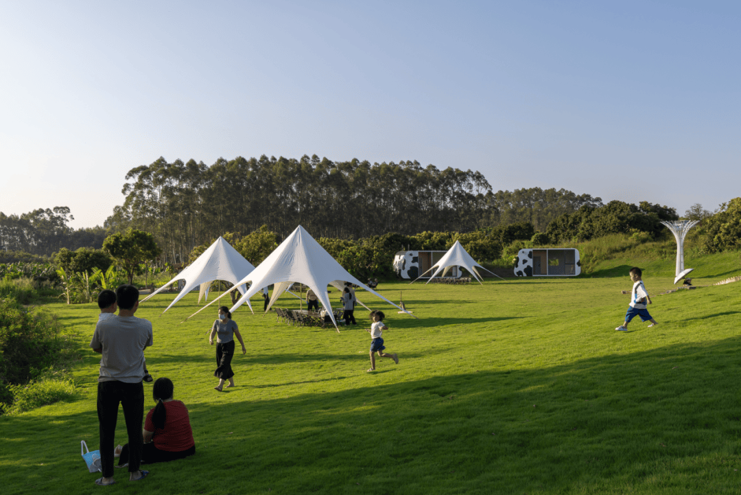 在保护完整生态基底与清晰田园肌理的基础上,通过功能区与动线游览串联,形成“入口服务-核心体验-生态渗透”的空间序列,并植入农场入口区、休闲垂钓区、帐篷餐厅区、活动草坪区及儿童互动区五大功能板块,从而构建一个集生态体验、休闲度假与自然教育于一体的近郊微度假目的地。 03. 运营导向 业态共荣的整体运营 设计以亲和力的品牌叙事为起点,自然感的黄色系块石结合钢丝交接闭合石笼结合生动可爱的IP萌宠雕塑,形成强烈的视觉记忆点。我们通过微地形与本土绿植的巧妙围合,自然地引导人流,在进入之初便营造出脱离城市、步入自然的仪式感与期待感。 星空帐篷餐厅:地景建筑与夜间经济载体 位于高处的轻盈膜结构帐篷,于浪漫之丘揽尽风光。以 “原野、星空、露营、烟火” 为概念,这里白天坐拥起伏花海与远山如黛,夜晚变身为星空之下的诗意餐厅。