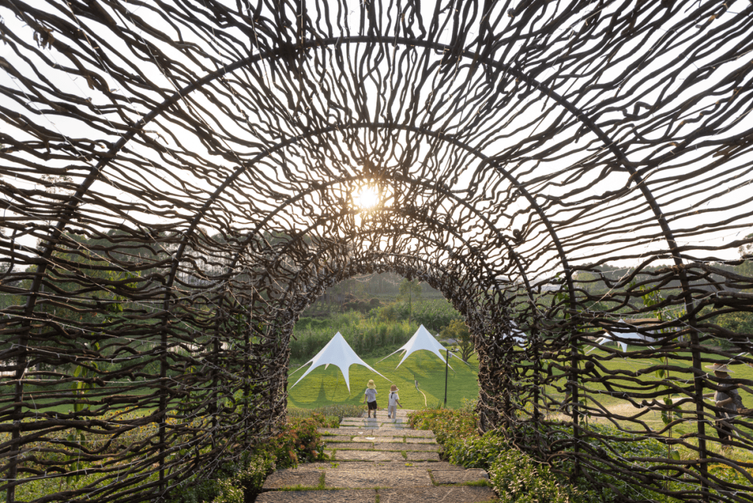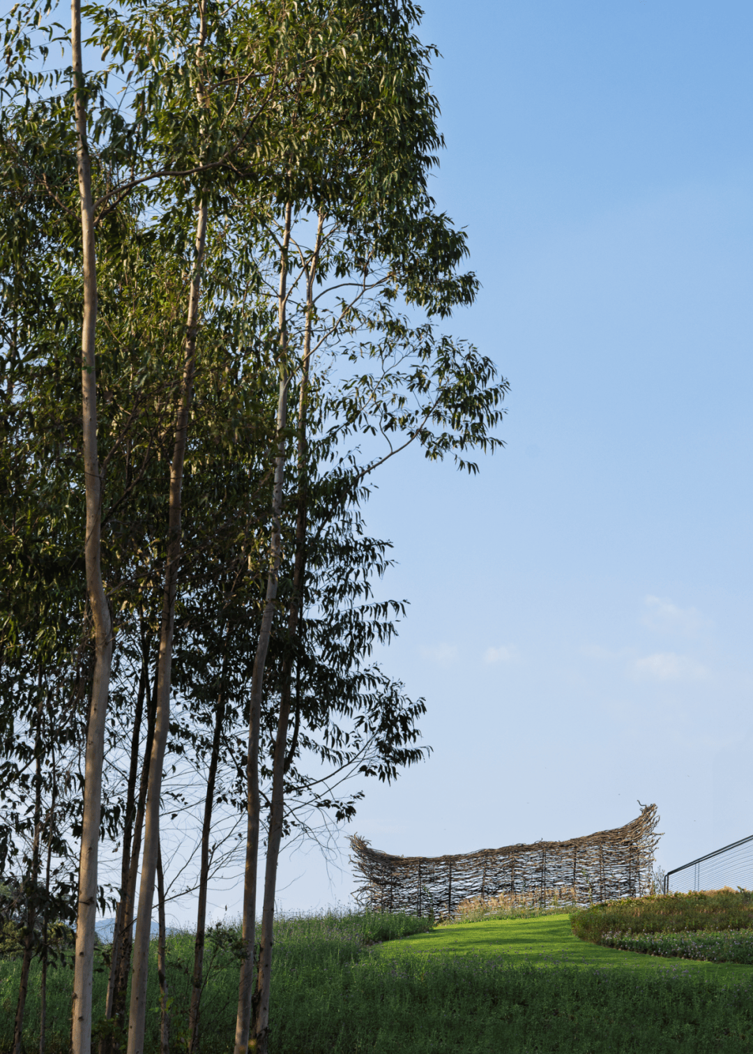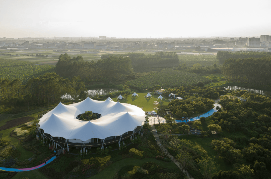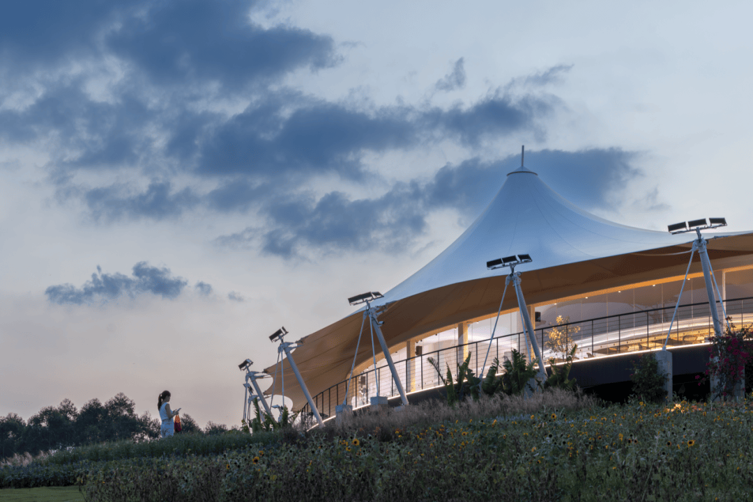 在保护完整生态基底与清晰田园肌理的基础上,通过功能区与动线游览串联,形成“入口服务-核心体验-生态渗透”的空间序列,并植入农场入口区、休闲垂钓区、帐篷餐厅区、活动草坪区及儿童互动区五大功能板块,从而构建一个集生态体验、休闲度假与自然教育于一体的近郊微度假目的地。 03. 运营导向 业态共荣的整体运营 设计以亲和力的品牌叙事为起点,自然感的黄色系块石结合钢丝交接闭合石笼结合生动可爱的IP萌宠雕塑,形成强烈的视觉记忆点。我们通过微地形与本土绿植的巧妙围合,自然地引导人流,在进入之初便营造出脱离城市、步入自然的仪式感与期待感。 星空帐篷餐厅:地景建筑与夜间经济载体 位于高处的轻盈膜结构帐篷,于浪漫之丘揽尽风光。以 “原野、星空、露营、烟火” 为概念,这里白天坐拥起伏花海与远山如黛,夜晚变身为星空之下的诗意餐厅。