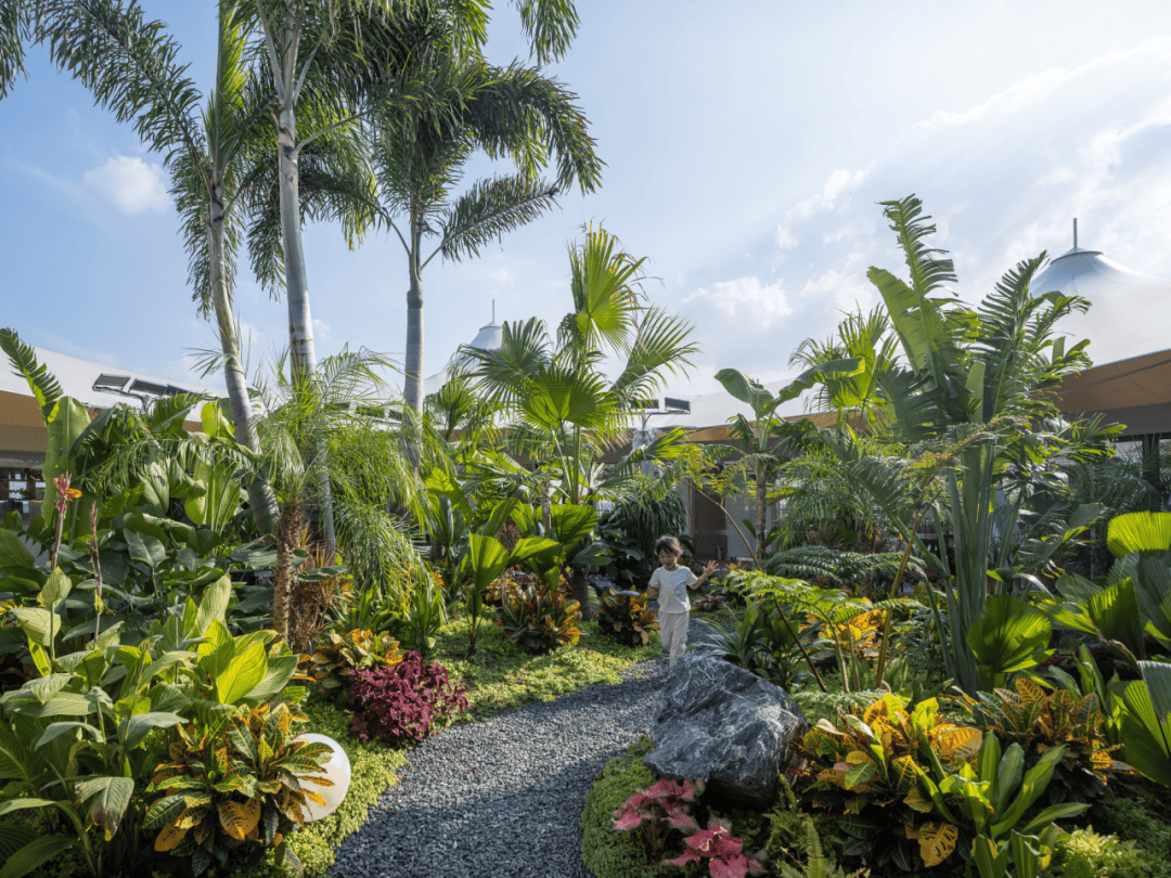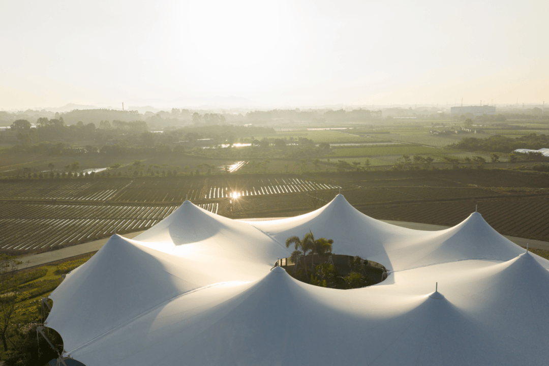 建筑屋顶采用纯白色张拉膜系统,造型如云端方舟,以大跨度、大体量的结构展现出强烈的超现实气质。PVDF等透光膜材,白天可引入柔和自然光,夜晚灯光亮起时帐篷宛如发光穹顶,抬头即可清晰观星。膜材重量仅为传统建材的1/10,运输安装更便捷;且表面有自洁涂层,抗紫外线、耐雨水腐蚀,适合户外长期使用。室外中庭在张拉膜的引导下,柔和地构筑各功能区边界,形成流动而连贯的空间体验。 帐篷餐厅内庭花园