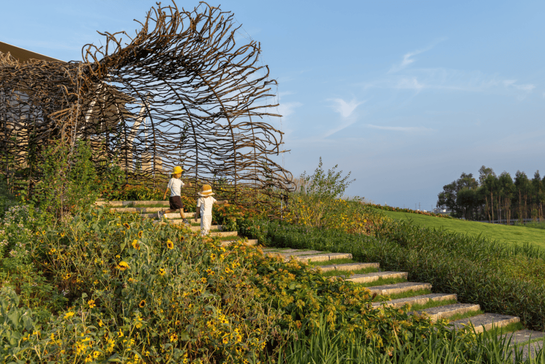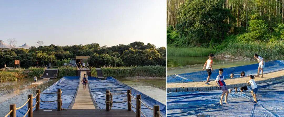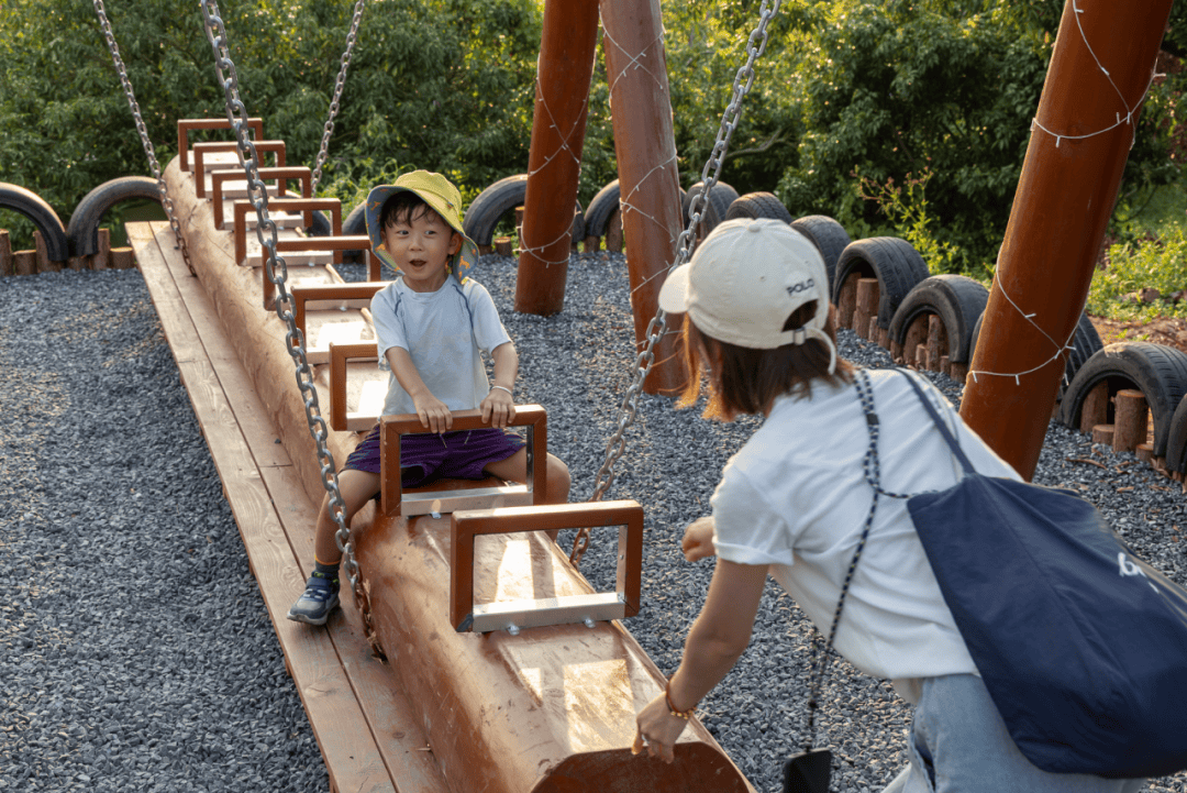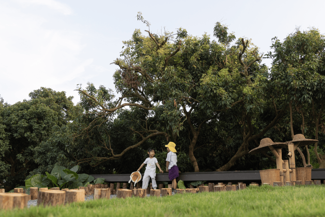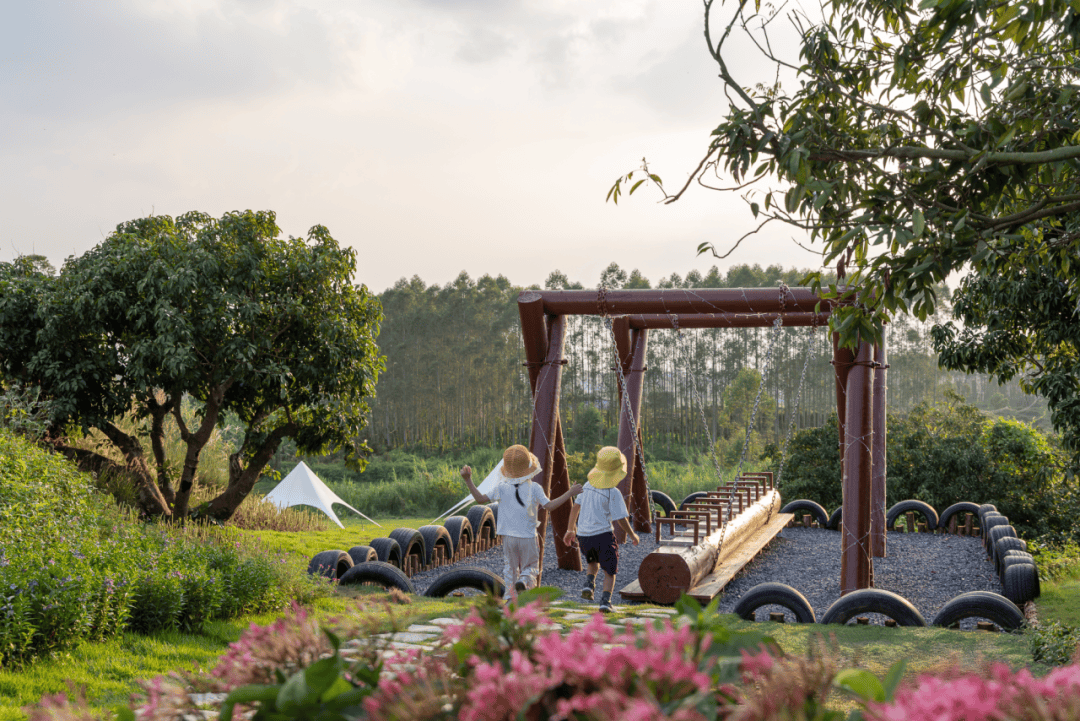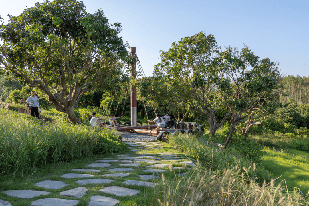 自然互动乐园:让游戏在土地中发生 儿童活动区的核心设计理念是“向自然学习”。没有冰冷的钢铁器械,我们选用木材、绳索、沙石、轮胎等天然材料,结合微地形与植被设计,打造打造安全又有趣的互动设施。孩子们可以在这里自由攀爬、探索、建造,在玩耍中直接感受材质的温度、植物的气味与地形的变化,激发创造力的同时,建立与土地的深厚联结。