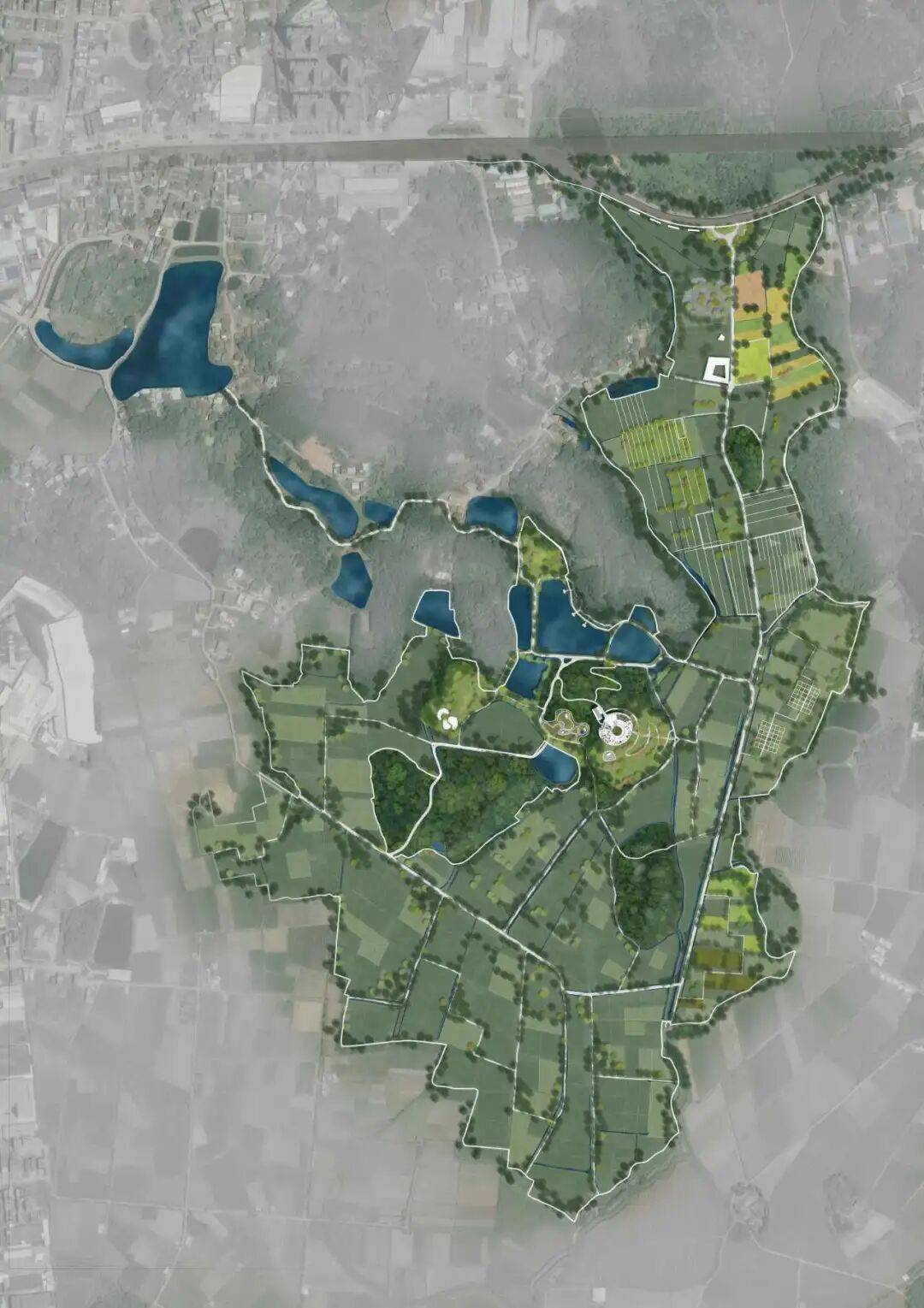 02. 总体规划 基于现状地貌的层级设计 农场设计以“系统性修复与场景化植入”为核心策略,遵循 “轻介入、可逆化、生态化” 的原则,通过系统性景观规划,将山下古村、农耕区域与自然生态片区整合提升。利用远期开发用地打造都市近郊型微度假目的地,达成品牌造势、文旅引流、品牌孵化的目标。 ▼罗浮山彩平