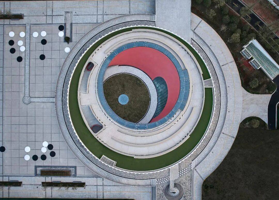 ↑ 西侧近景鸟瞰 摄影:章鱼见筑 围棋,黑白二元,虚实相生,蕴含着深厚的哲学内涵,其抽象的内核与建筑空间存在天然的契合性。围棋馆不仅作为展览的容器,更被设计成一个空间叙事的典范,一个能够传递情感的精神场所。 设计深植衢州本土文脉与自然肌理,融衢州山水之特色,取棋子棋盒之形态,拟天生石梁之圣境,寓虚实围合之气韵,成为展示烂柯围棋文化的重要窗口。