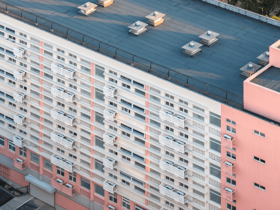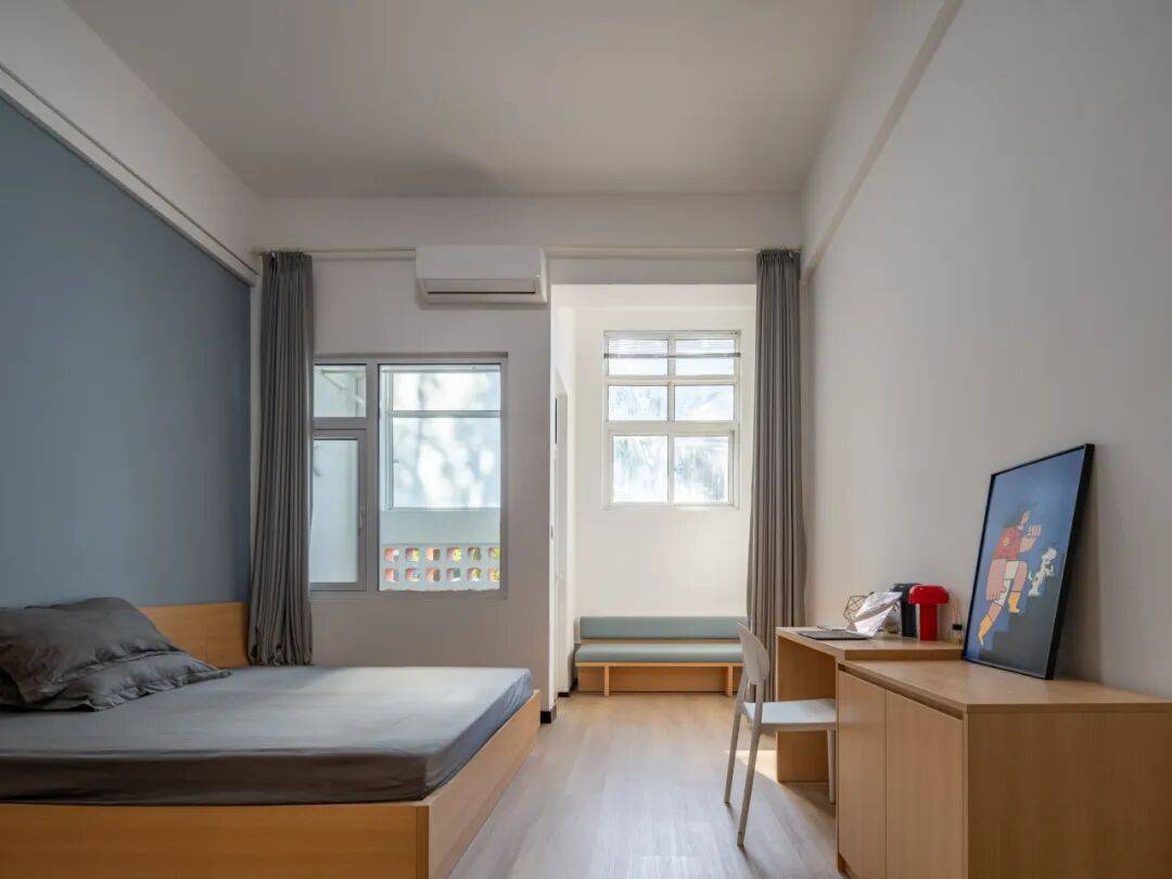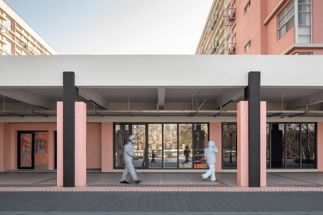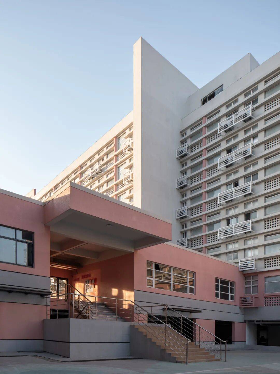 △ 整体色彩效果 整修后的建筑立面色彩温暖,白色构件和粉色墙面形成强烈的对比和光影效果。建筑的室内空间则摈弃了原本干湿不分离的设计,增加空间分割、去除后期添加的色彩、提高材料标准,呈现了简洁明快、性价比高的租住空间。