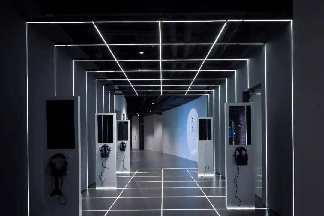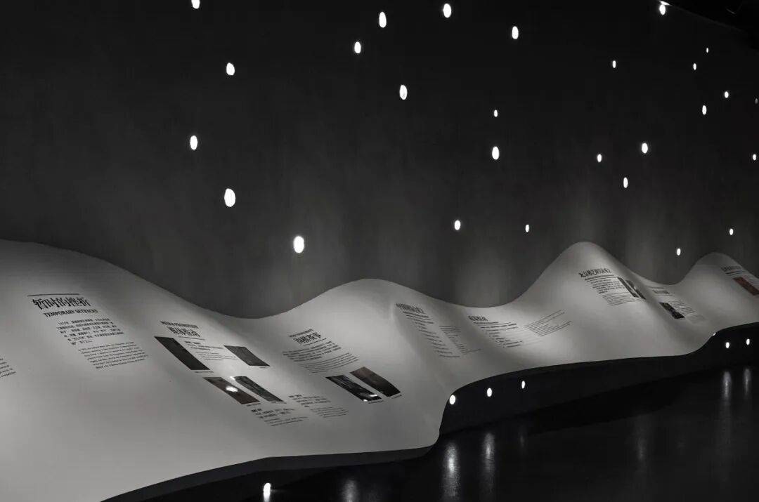 ↑ “光之径”弧形坡道 摄影:刘国威 展陈以黑、白、灰为主色调,既吻合围棋棋子的色彩,也与建筑本身的清水混凝土肌理形成对话。设计突破传统博物馆以静态陈列为主的模式,致力于营造一个可感知、可沉浸的“围棋美学场域”。通过空间叙事与艺术表达的深度融合,我们试图将围棋的历史、哲学与文化内涵转化为一场身临其境的体验,使观者在行走中感悟“烂柯一梦,行无止境”的意境。为消解围棋文化的认知壁垒,展陈设计中引入了艺术化表达手法与多媒体互动装置,构筑了一条从感知、互动到理解的渐进式参观路径,将抽象的文化转化为可感知的多维体验,完成了围棋从小众到大众的转译。