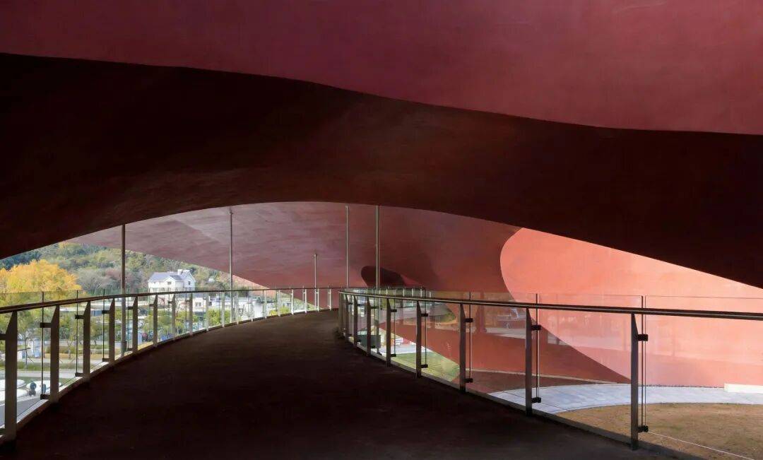 ↑ 主入口近景鸟瞰 摄影:刘国威 建筑以棋子的圆形为母题,通过圆形组织空间与形态关系,将围棋文化中的围合、渗透、阴阳等理念转化为可感知的建筑空间。60米跨度的红色清水混凝土拱状似烂柯山天生石梁,将地域特质凝练成建筑语言,在外立面上形成“负阴抱阳”的曲线形态。建筑基座墙体采用质朴厚重的毛石墙,与上部温润如玉的清水混凝土形成强烈的视觉对话,呼应围棋阴阳平衡的核心哲思,让材料语言与文化内涵实现深度共生。 ↑ 形体生成 绘制:杜城汐 ↑ 视线分析 绘制:何攀