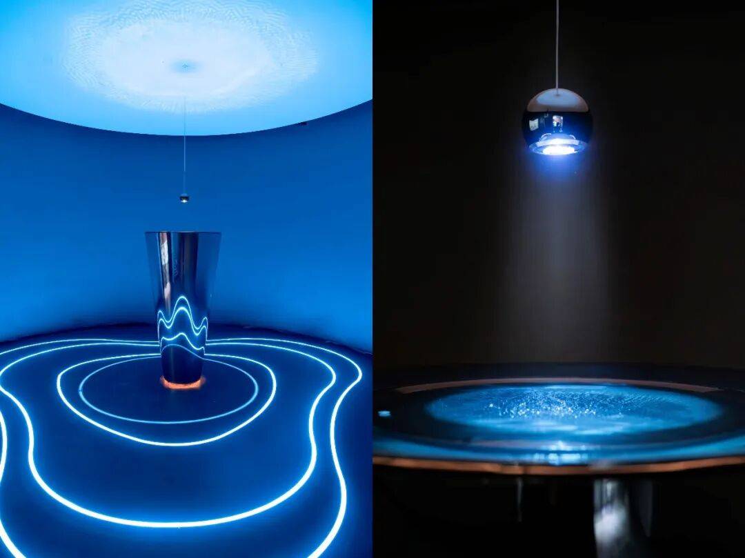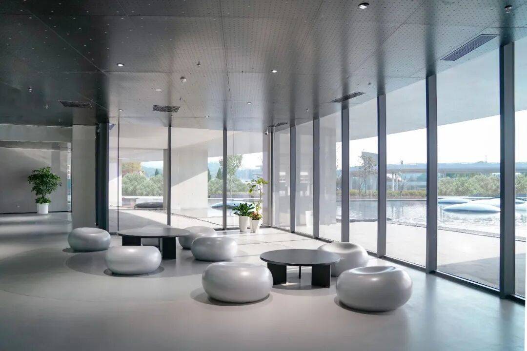 ↑ 互动装置 摄影:刘国威 世界围棋文化馆的家具与视觉设计,将围棋、太极与宇宙三者共通的东方哲学——对立统一、动态平衡与无限可能,转化为贯穿始终的线索。 入口桌椅组合以圆形为母题,采用纯粹的黑白两色搭配,暗合 “阴阳相生” 的围棋之道。位于红色混凝土拱顶下的文创售卖区展台状似永子制作时滴落的棋子,高低错落,与窗外的群山相呼应。