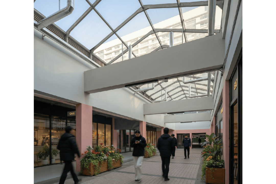 △ 重新注入活力的连廊 园区和城市之间原本是扎满刺藜的围墙,在更换形式、局部打开之后,变成园区与城市之间的半开放的界面:安全管理、入住、班车集散、招工、街头餐饮,这些寻常烟火气一如既往地存在,且更加自由、更加轻松。