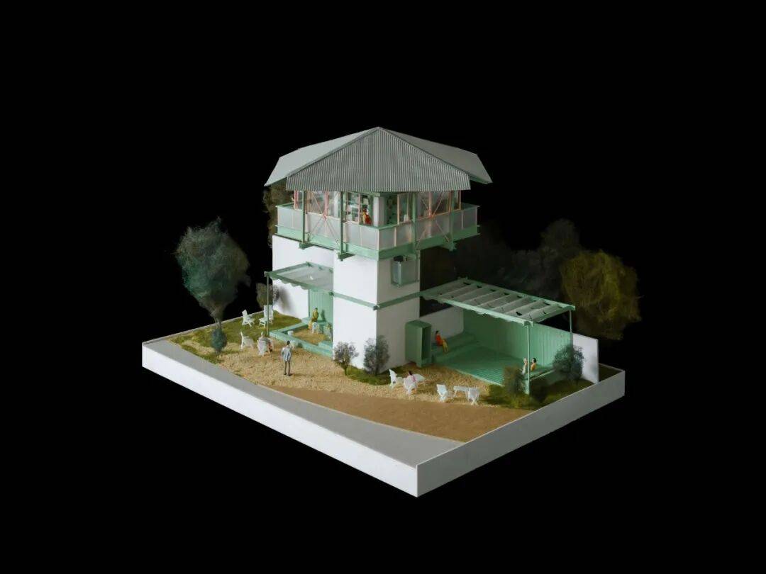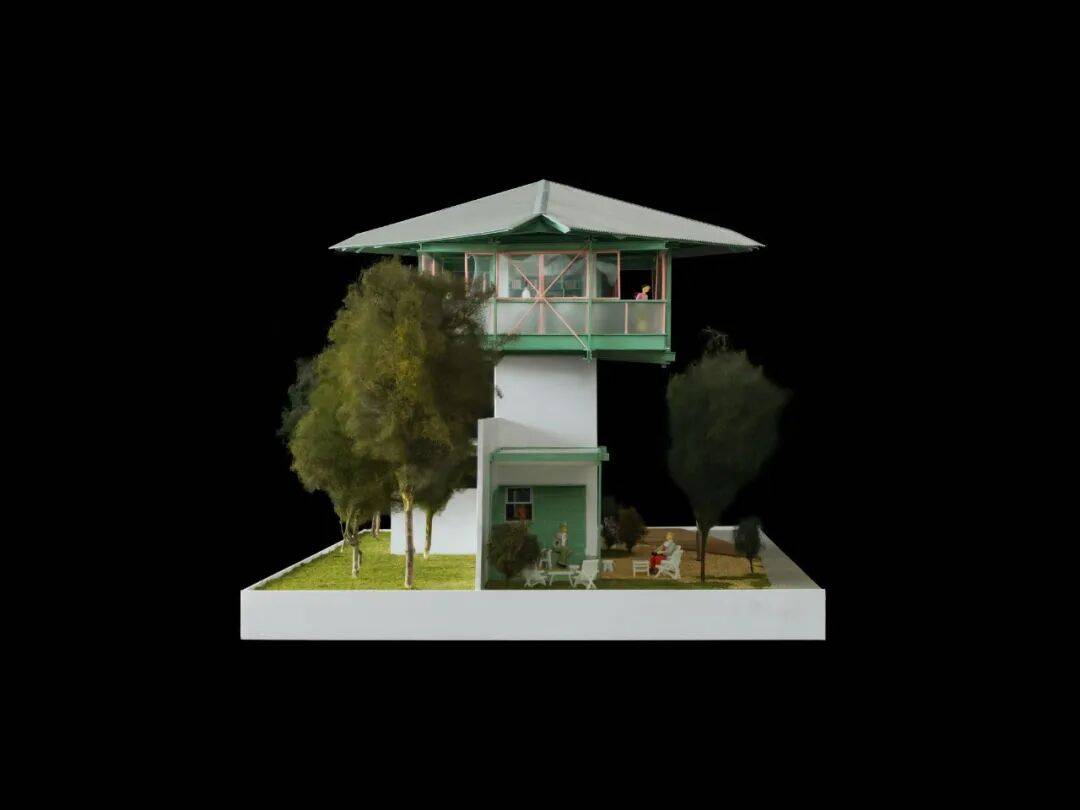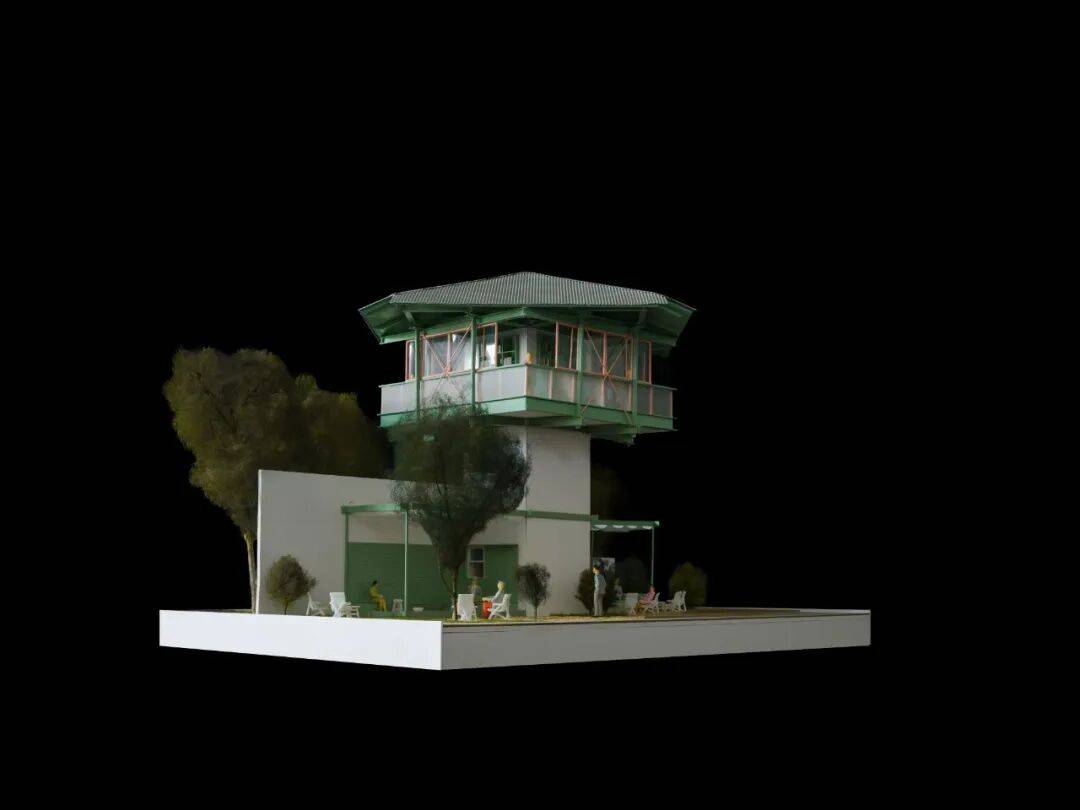 建筑原始外立面©SZ-Architects 现场勘探 看守塔一层面积仅7平方米,二层巡逻平台可全方位俯瞰园区。同时窗户的栏杆上还保留了机枪架及监视孔,建筑本身功能非常清晰单一。