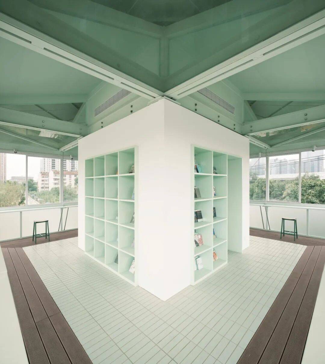 建筑体块前期推导©MATA OKAWA 项目信息 项目名称: 一间很小的24h书店 项目完成年份: 2025年12月 项目设计年份:2024年6月-2025年4月 建筑面积: 70m² 建筑设计/室内设计: 实在建筑设计工作室 联络人姓名:张志坤 公司所在地:上海/东京 主创建筑师: 张志坤,刘悦 设计团队: 申亚宁,孔德勇 项目地址: 中国安徽省合肥市合柴1972西北门 委托方: 一间很小的书店 结构设计: iStructure结构事务所(杨笑天、吴琨营、王哲) 景观设计: 南京见植园艺有限公司 施工方: 合肥固宇建筑装饰工程有限公司 结构加固单位:中佰工程设计集团有限公司 物业:合肥滨投文化创意发展有限公司 材料:木塑地板,绿色条形瓷砖,银色波纹彩钢板,白色乳胶漆 摄影师: 大川又Mata Okawa,实在建筑 视频拍摄: 实在建筑设计工作室 视频音乐: A-muzik studio