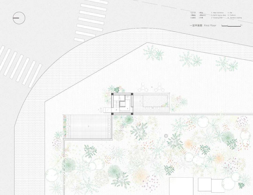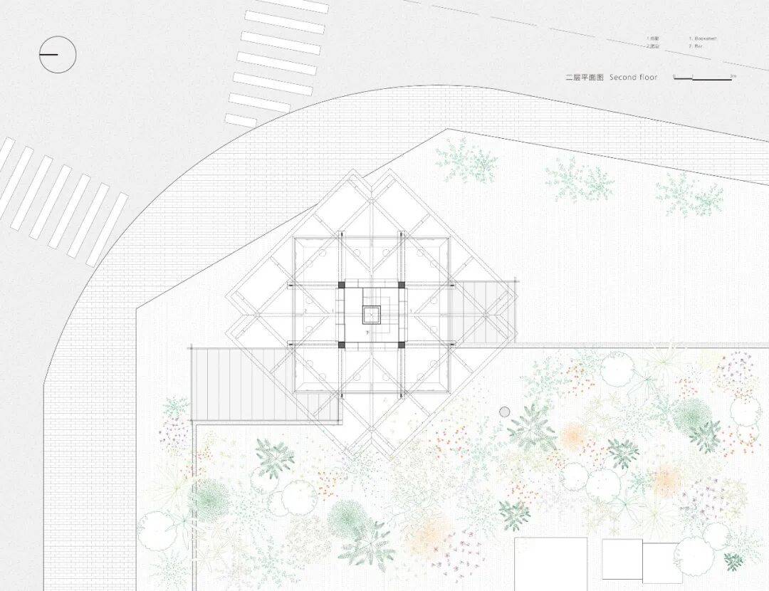 楼梯间阅读区©MATA OKAWA 建筑南北两侧各增加1个户外平台区,分别满足咖啡售卖及书店、园区定期举办活动。