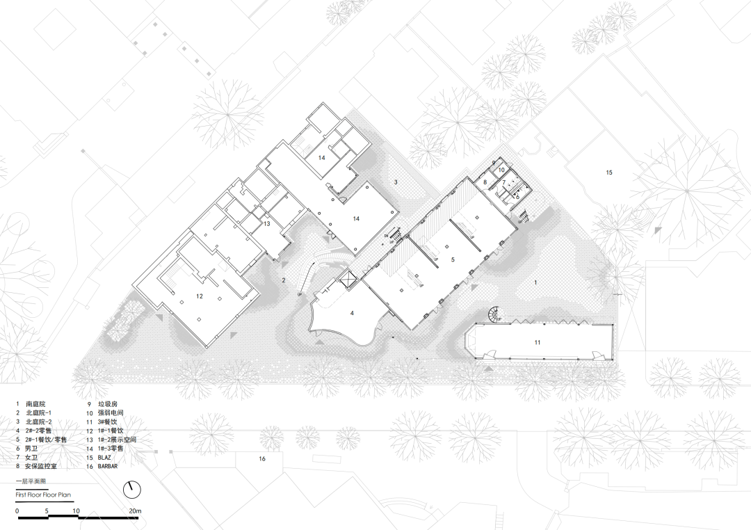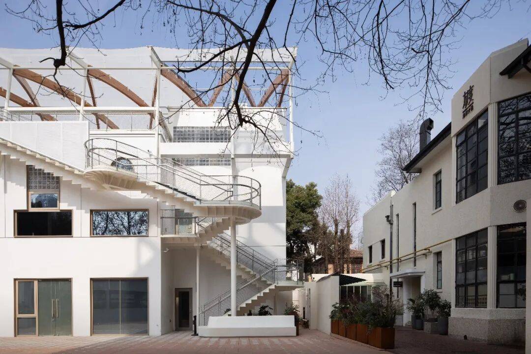 © 党航 “呼吸”具化为庭院系统:围绕 2800 平方米的开放空间,形成南北两院。南院(约 400㎡)由 2、3BLAZ 洋房围合。拆除隔墙后,洋房的历史立面成为庭院的自然边界。3,经调整至约 6 米以适配餐饮需求,其北端切角与 2,三侧立面打开后形成了连接庭院的活力转角。北院(约 300㎡)划分为公共前院与私密后院,以一个透明玻璃盒子轻巧区隔,结合未来运营需求,清晰区分使用场景。