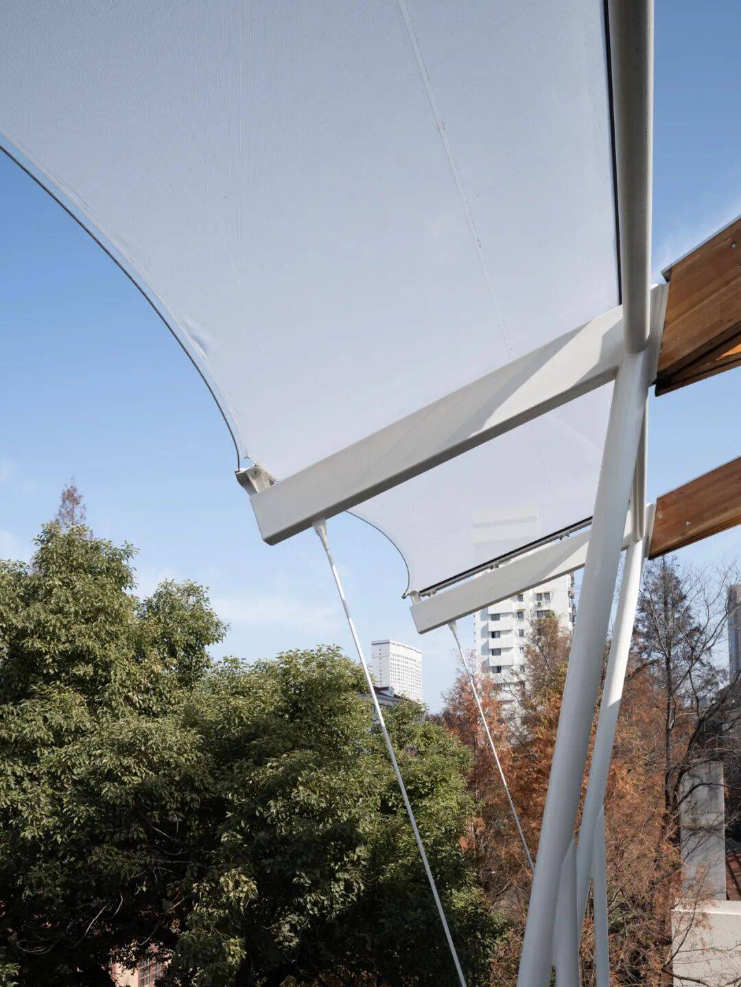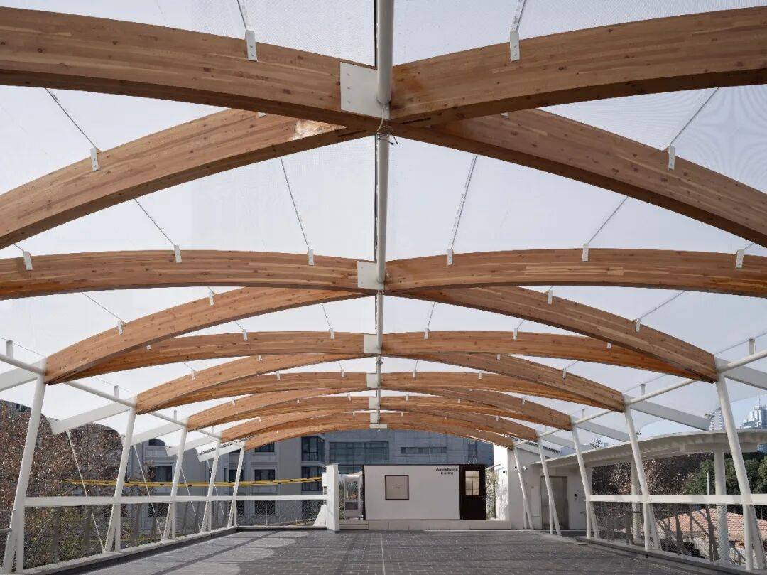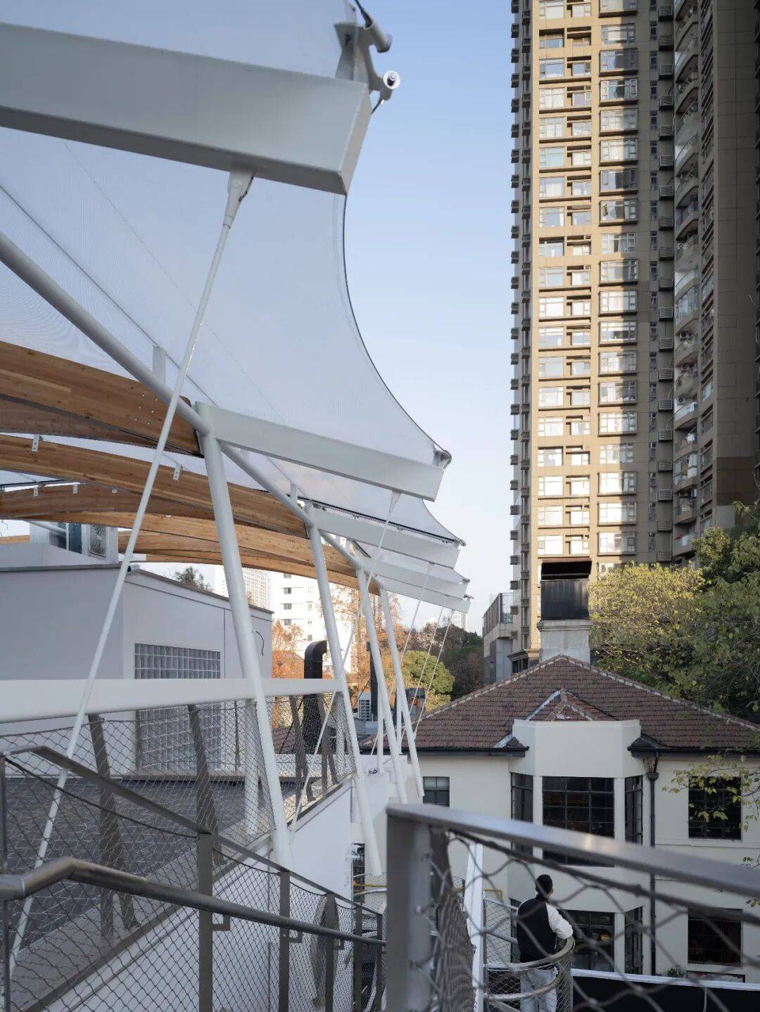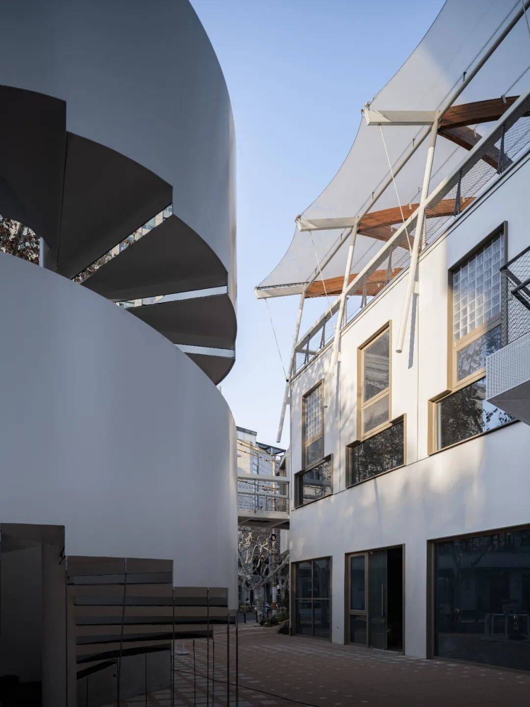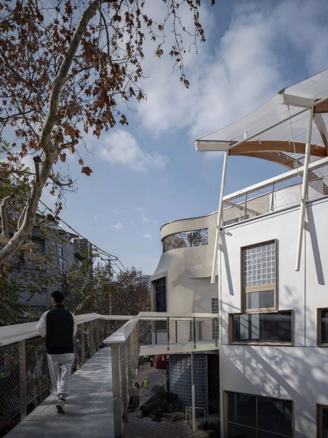 © 党航 “游乐”由立体游廊系统实现:空中连廊与钢构楼梯将庭院、平台与屋顶串联为可循环的立体场所。路径从南庭院旋转楼梯开始,经连廊穿越 2,抵达北侧休息平台与屋顶花园,最终从南侧回到地面,形成一段连贯的探索体验。