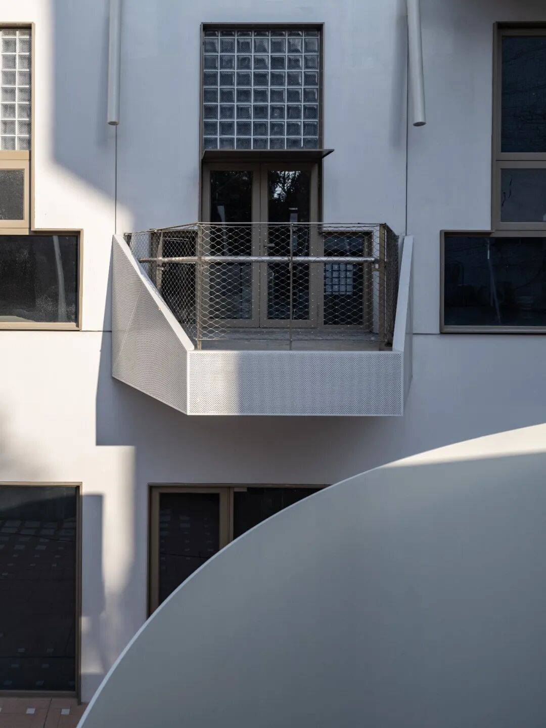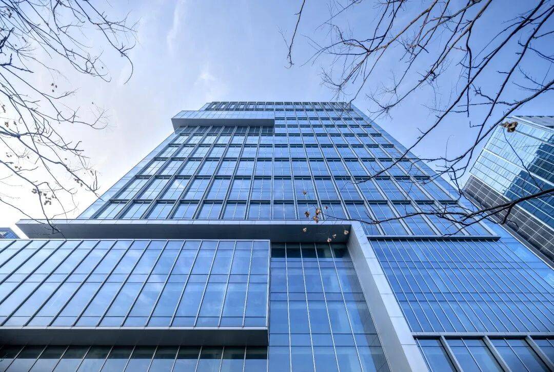 幸福南路立面街景©筑言建象-建筑摄影 幕墙设计采用纯净的玻璃幕墙与铝制竖向构件搭配,以极简的材料组合追求极致的质感表现。玻璃的光泽与金属的哑光形成微妙的材质对话,纵向延伸的线条在视觉上消解了塔楼的体量压迫,而恰到好处的体块分割与咬合关系,既弱化了主立面的单调,又通过阴影凹凸增添了立面的层次深度。每一处细部收口、每一条缝隙对位,都体现着设计师对简洁利落、质感优雅这一美学标准的执着坚守。