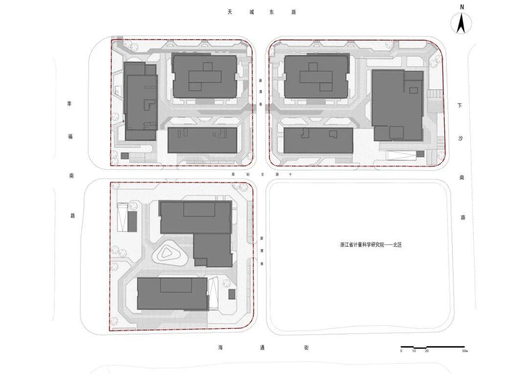 项目鸟瞰图©筑言建象-建筑摄影 02. 设计理念 坐落金沙湖畔,项目以四个塔楼与围合内街为核心,构建高效办公、活力商业与湖景交融的未来城市综合体,重塑下沙CBD天际线与滨湖办公新范式。