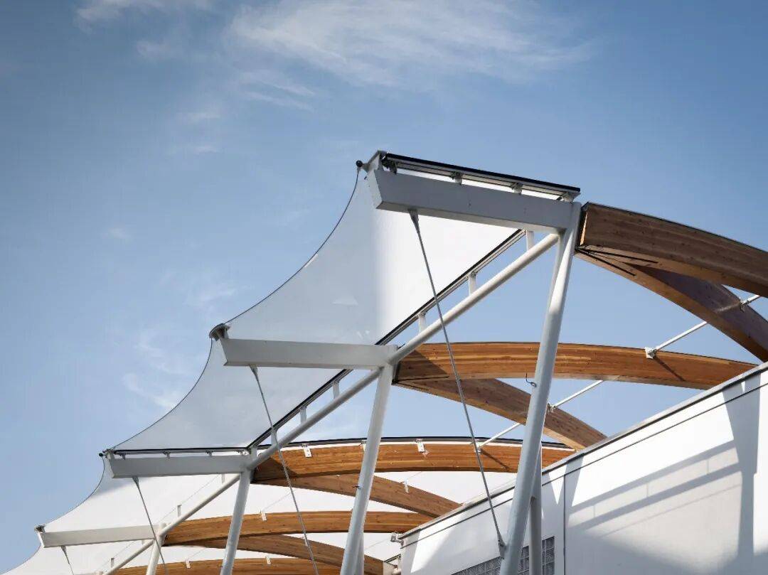 © 党航 2#-2 沿街体量严格遵从宗地图边界:范围外拆除以释放前场,利用范围内保留的结构柱网,结合场地几何生成平缓的立面曲线,柔化周边环境对话关系。屋顶增设钢木覆膜顶棚,形成半开放空间,呼应 “From farm to table” 理念,为市集、展览、实验性种植提供多样可能。