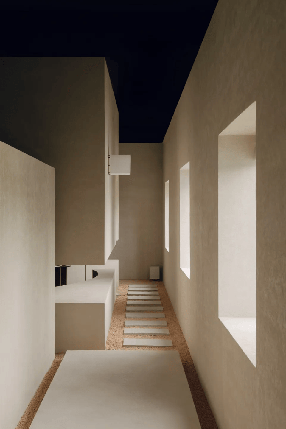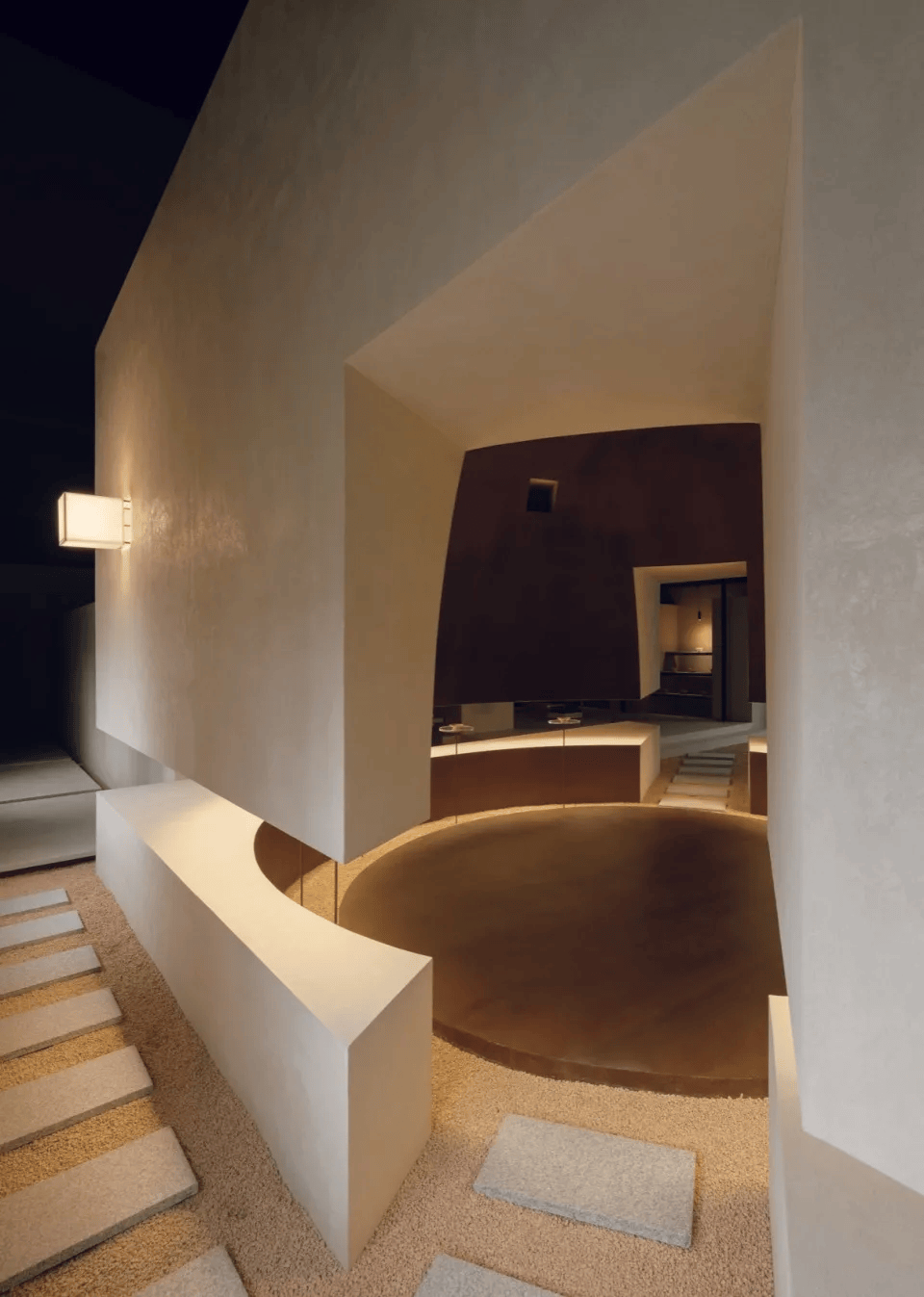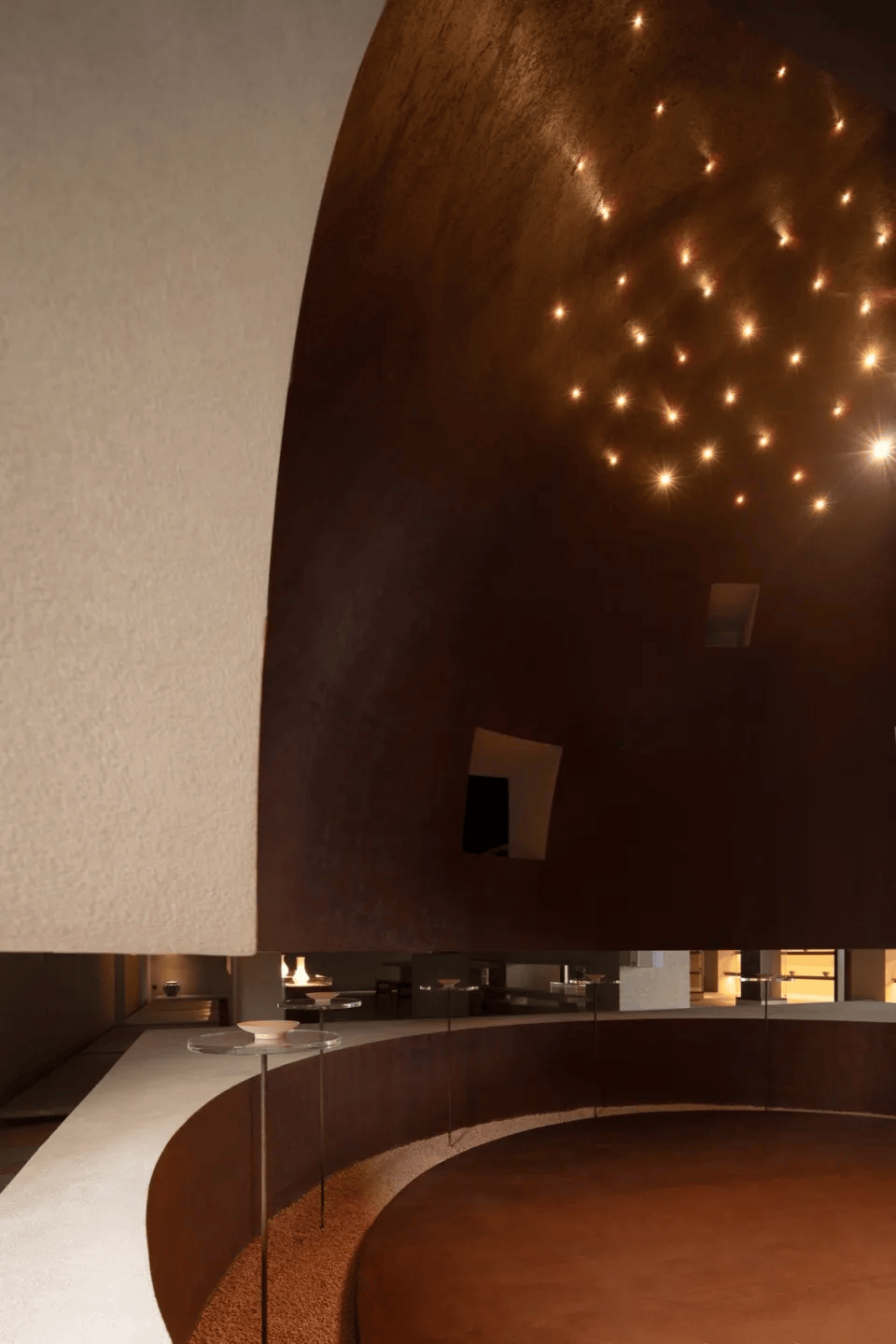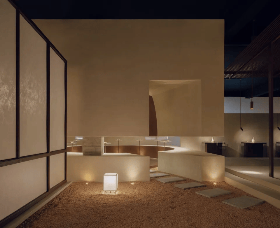 ©刘章悦 寻饮(SipSeek)空间是一处精酿酒吧与当代艺术画廊的复合体,位于上海松江区的百原云谷文创园区。该空间通过独特的设计,将艺术与精酿文化融合,创造了一个与精神世界对话的场所。圆形空间内的座椅和光影变化让人沉浸在时光流逝的静谧氛围中。空间没有明显的边界,精酿与画廊之间通过高差自然过渡,流动的艺术展品与酒文化交织,形成了漫游感。不同层次的座椅布局与隐秘的动线设计确保了私密与公共空间的和谐,营造了一个让人寻找内心宁静的精神家园。