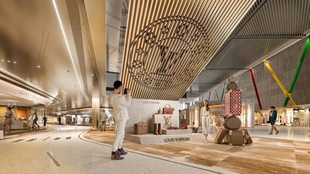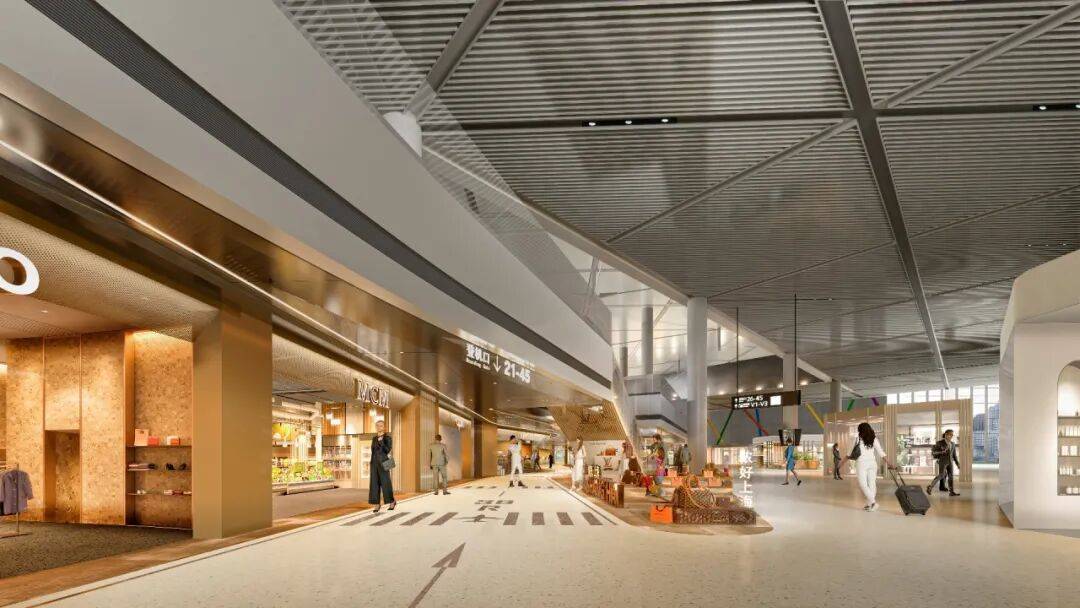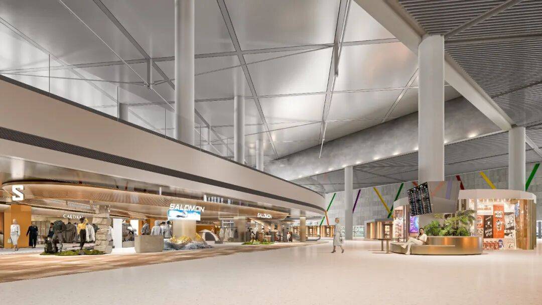 从“机场商业”到“云端旅程” 设计团队以“虹光云桥”为概念主线,将旅客动线的设计转化为一段沉浸式的空间三部曲: 跑道序曲—— 通过地景艺术与导向设计,模拟飞机滑行升空的动感,巧妙引导旅客探索商业区,同时以趣味性的方式引发对航空文化的好奇与互动。
