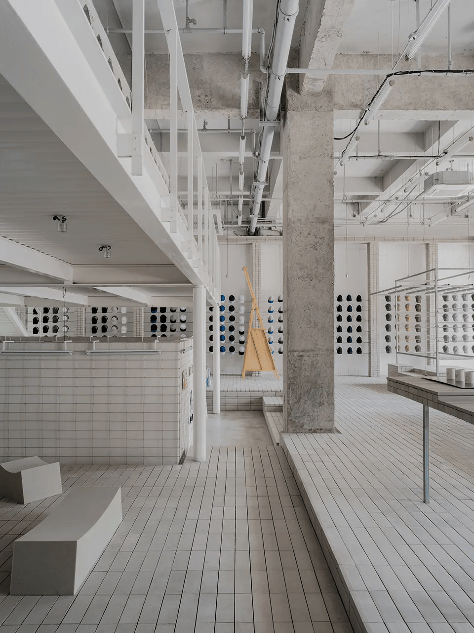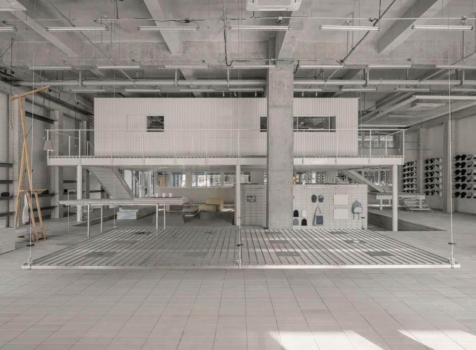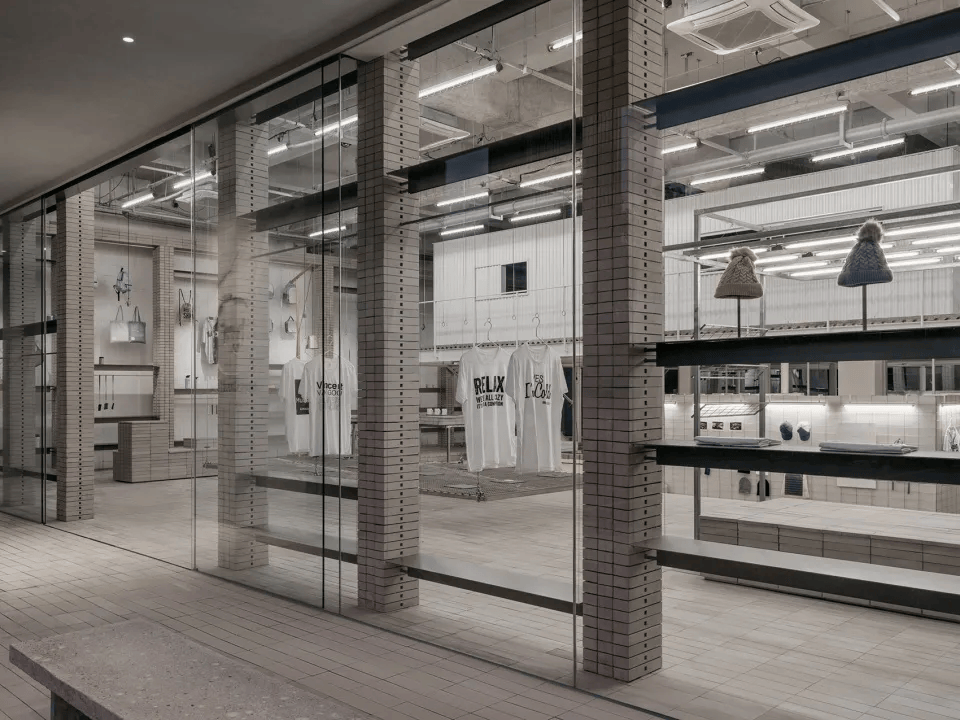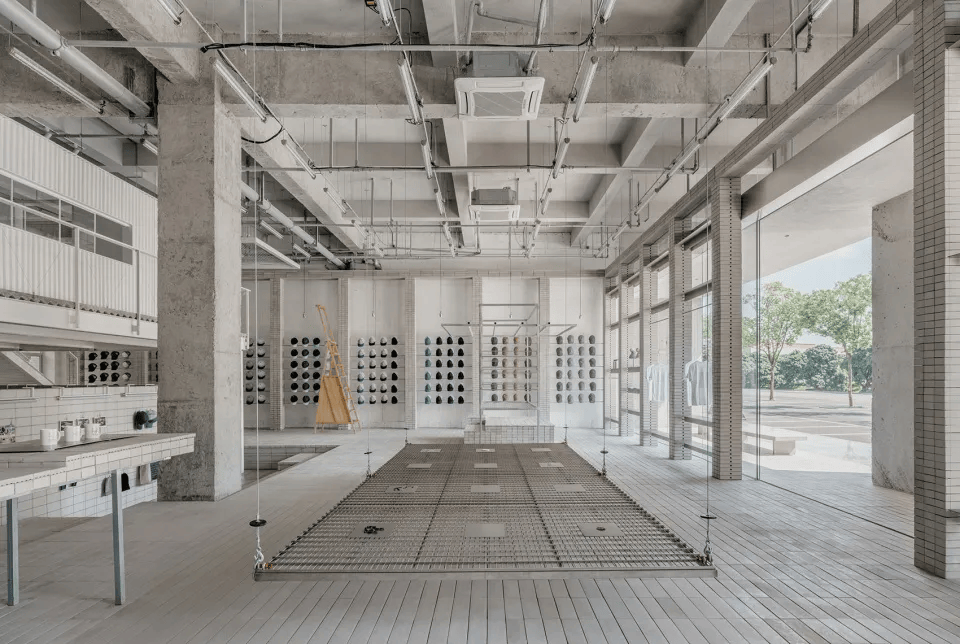 HumCustom展厅以工业构造为基底,展现品牌的定制理念。入口后退形成缓冲区,混凝土墙拓印产品轮廓,象征从白胚到个性化定制的转变。展厅采用环形流线布局,二层为仓储与办公,一层为展示区,立柱融入陈列功能。裸露钢架与混凝土构件强化建筑肌理,可升降金属网适应节日展出,海绵家具更换面料实现更新。灯管展台、陶砖台阶、楼梯陈列区增强灵活性,使空间成为品牌定制理念的具象表达。