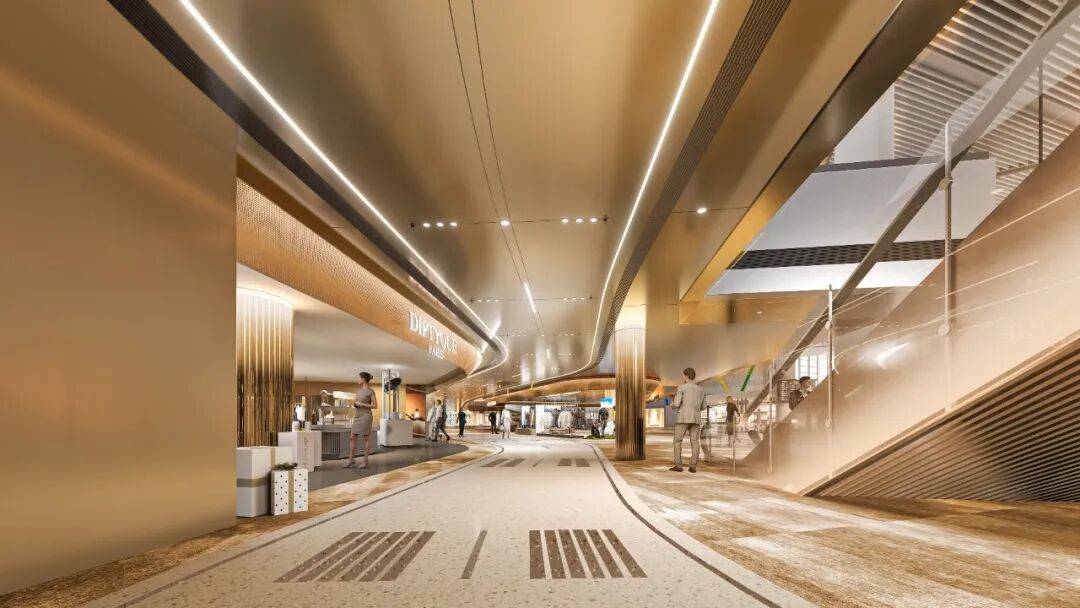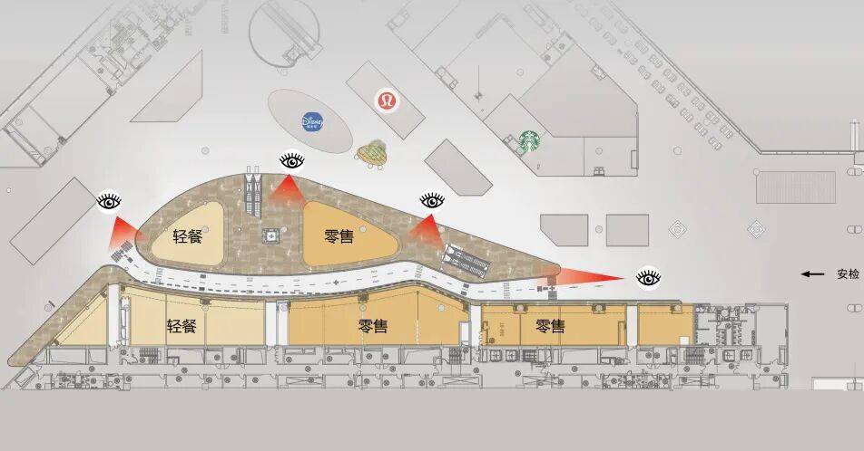 空间的焕新让细节被看见 针对原有空间存在的“店铺隐蔽、动线割裂、标识模糊”等问题,设计团队在细节上则通过以下策略实现焕活。 标识融入情境:改造前该区域标识和指引明显不足,人流在此无任何停留,改造后在地面嵌入香槟金色“跑道线”,与登机口标识结合,形成兼具引导与打卡功能的视觉符号。