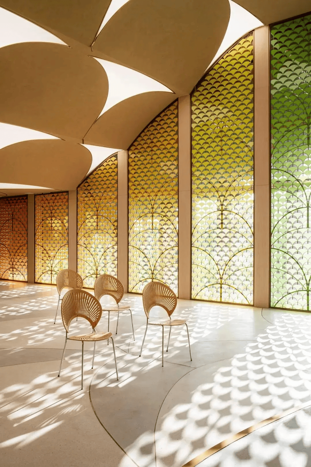 云端漫步—— 镂空结构与光影交织,再现穿越云层时的霞光意境,周边均被金色的阳光笼罩,阳光顺着镂空的门头、柱子撒到空间中,形成温暖、有调性的商业空间氛围。
