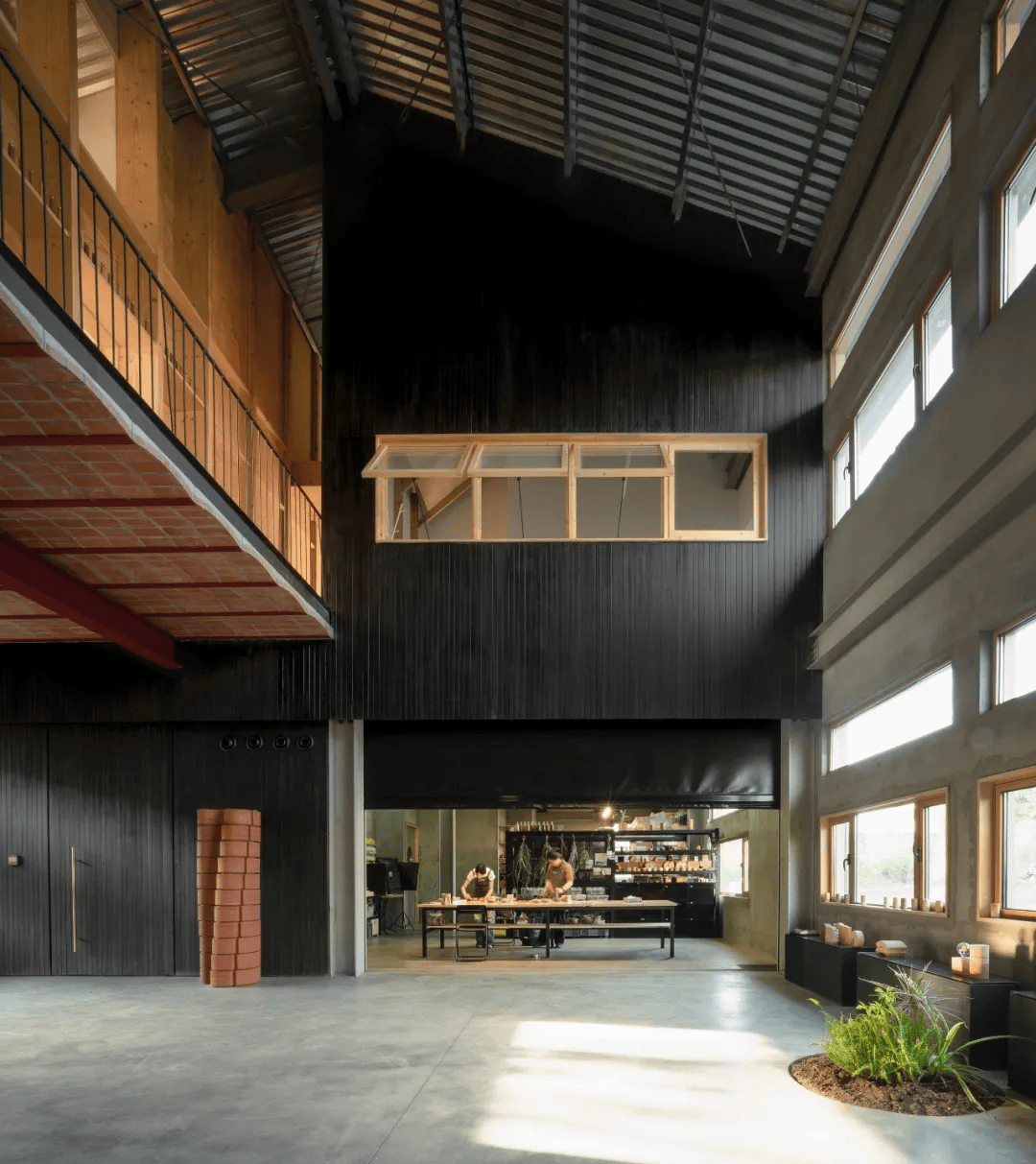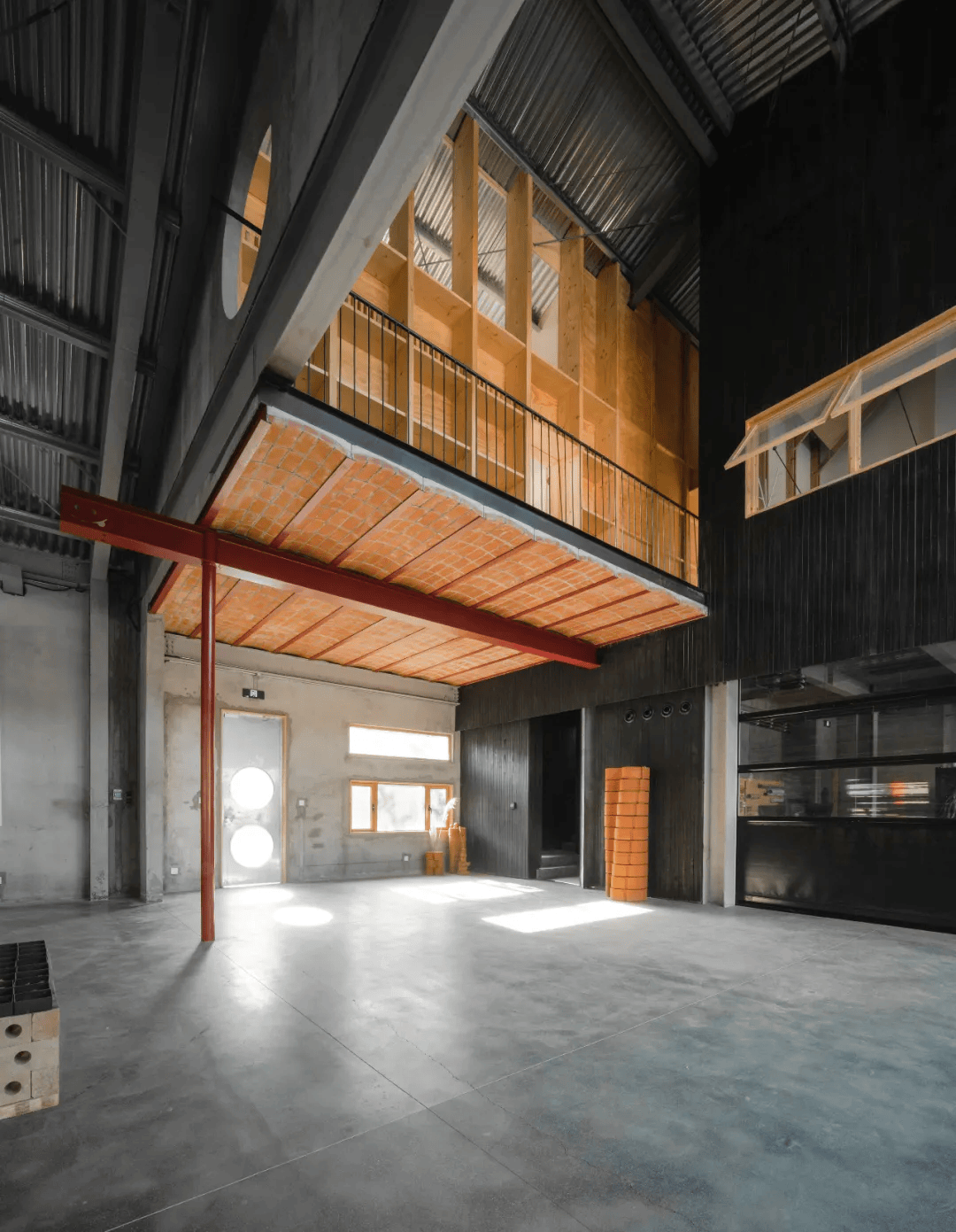 该改造项目以“简朴材料 + 精准介入”策略,在预算与施工条件双重限制下,完成对钢结构旧厂房的转化。原建筑由南低北高两坡屋面体量构成,设计以9米通高空间为界,划分为开放展示区与私密实验/办公区。新增会议室与连廊体量“悬浮”于通高处,在模糊边界中强化空间体验。材料方面,采用型钢、红砖、胶合板等基础建材,以最简构造应对施工不确定性。其中会议室楼板使用“加泰罗尼亚拱”式砖拱结构,展现“低技建造”中的精巧与勇气。整体设计回归建造本真,在克制中追求材料的精神表达。