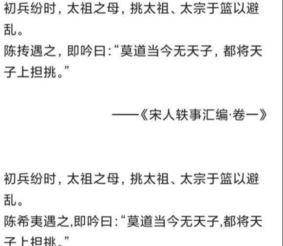 这首诗后来成为了宋朝历史上最为著名的揭语之一。 陈老神仙的诗究竟是什么意思呢?它的含义非常直接。别再说当前乱世没有真正的天子了,看看这位老太太,一根扁担竟挑起了两个未来的天子! 这首诗不仅展现了赵匡胤与赵匡义的未来,也暗示了他们都将成为皇帝。这是一个富有趣味且直接的预言,仿佛一开始就注定了他们的命运。 这个故事流传甚广,记录在宋朝的两本野史杂文《宋人轶事汇编》和《绘像列仙传》之中。两本书的记载几乎一模一样,几乎没有任何差别。