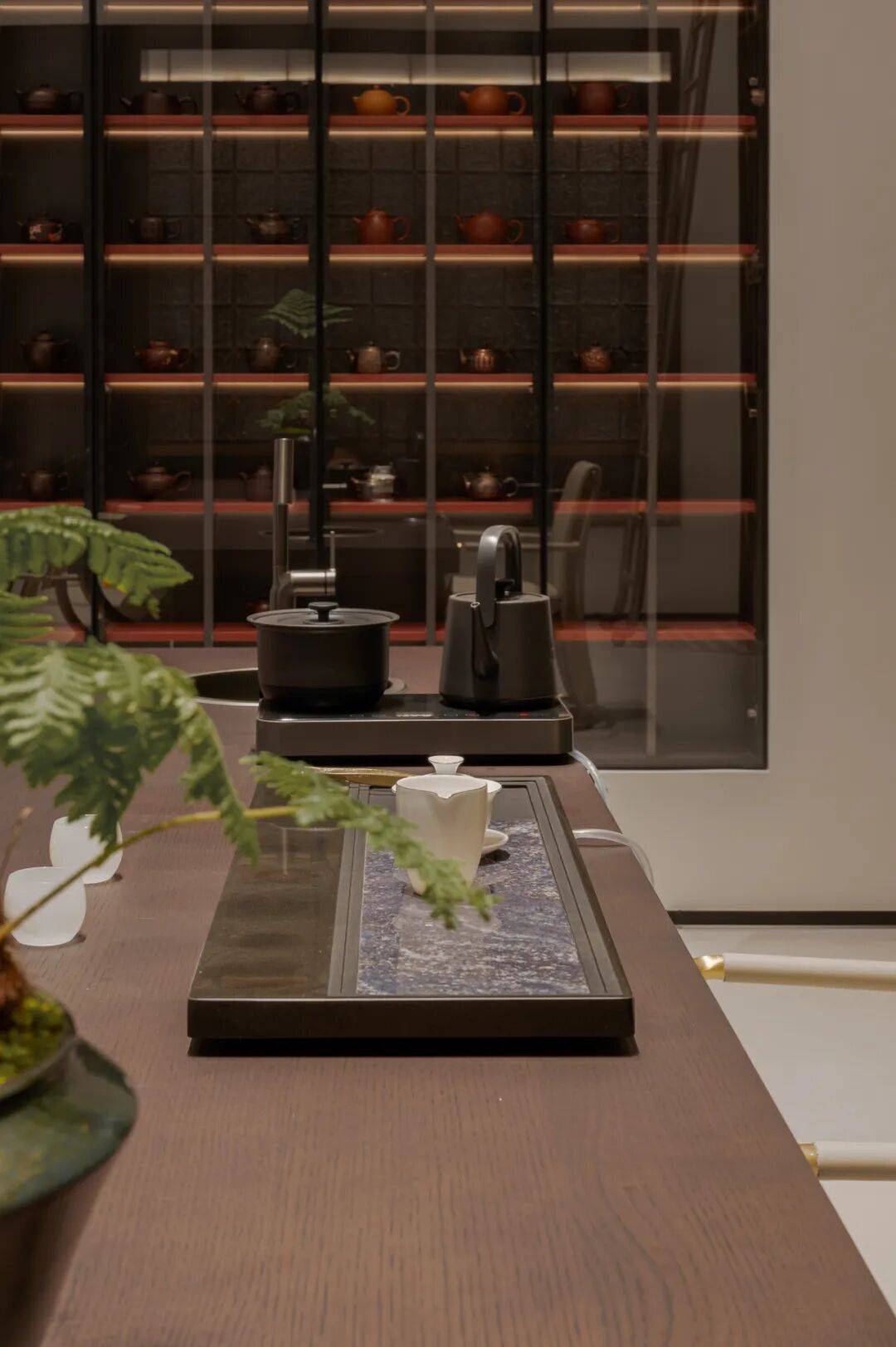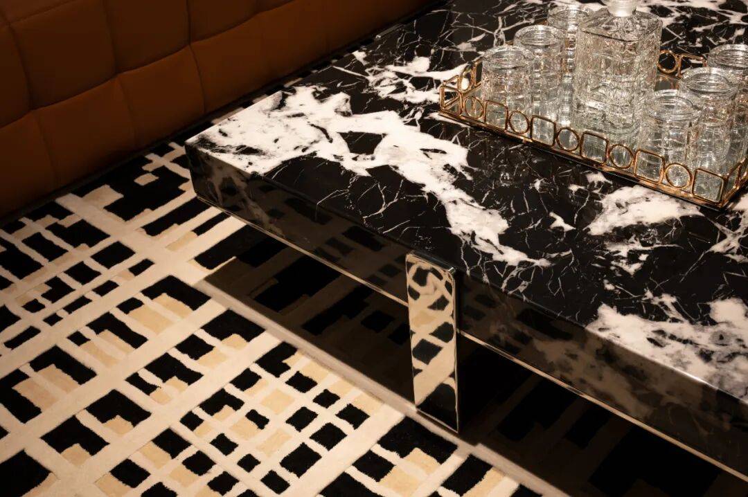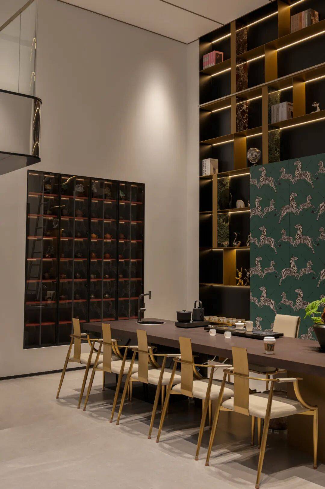 品茗区域 色彩的差异和光感的变化 为空间带来了鲜明的层次感和丰富度 巨幅装饰画 呼应空间色彩的同时 进一步烘托生动活泼的空间氛围 金属的质感与光线的交织将整个空间赋予独特的钝感力 以线条节奏去构建流动的空间感