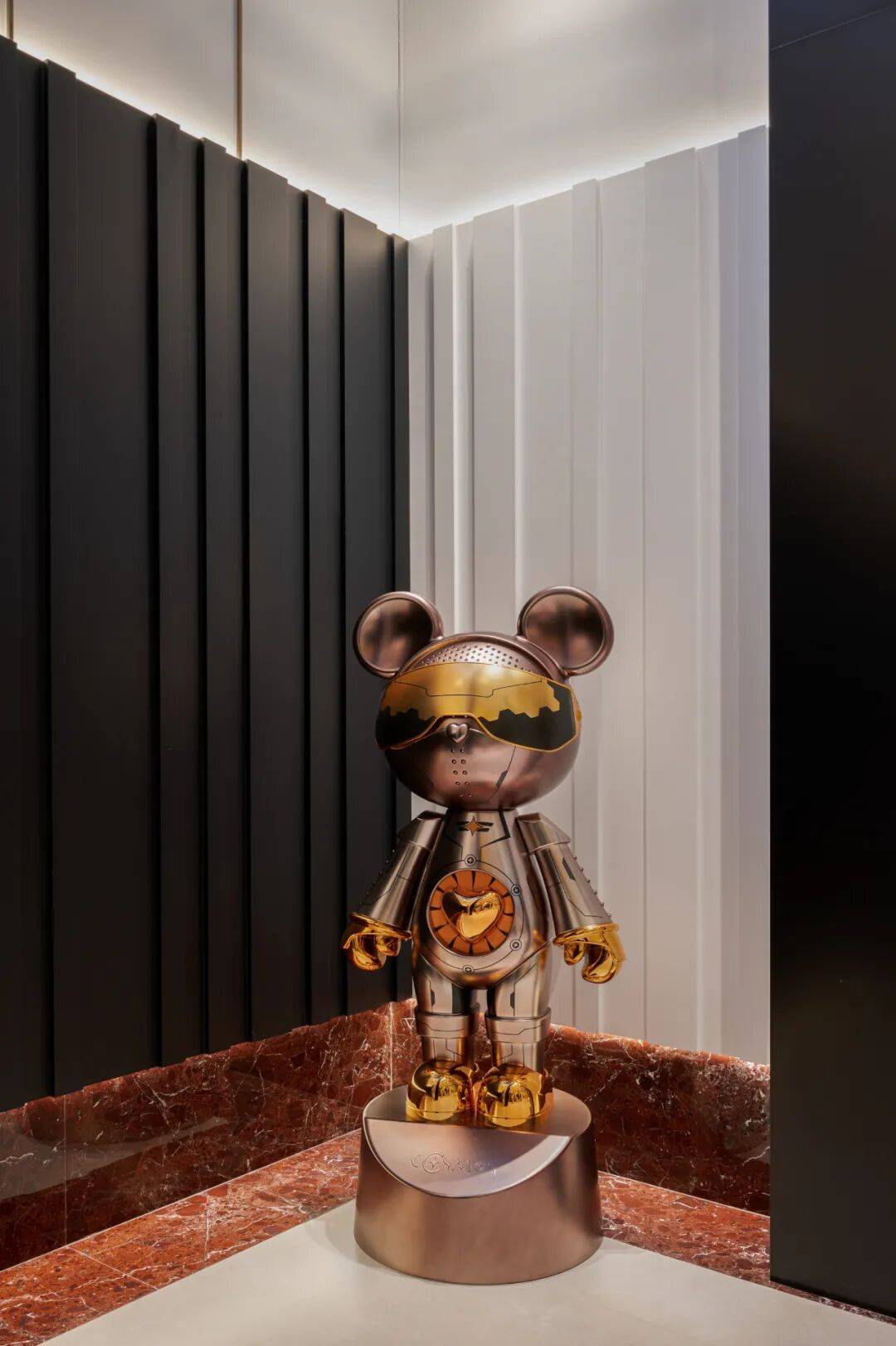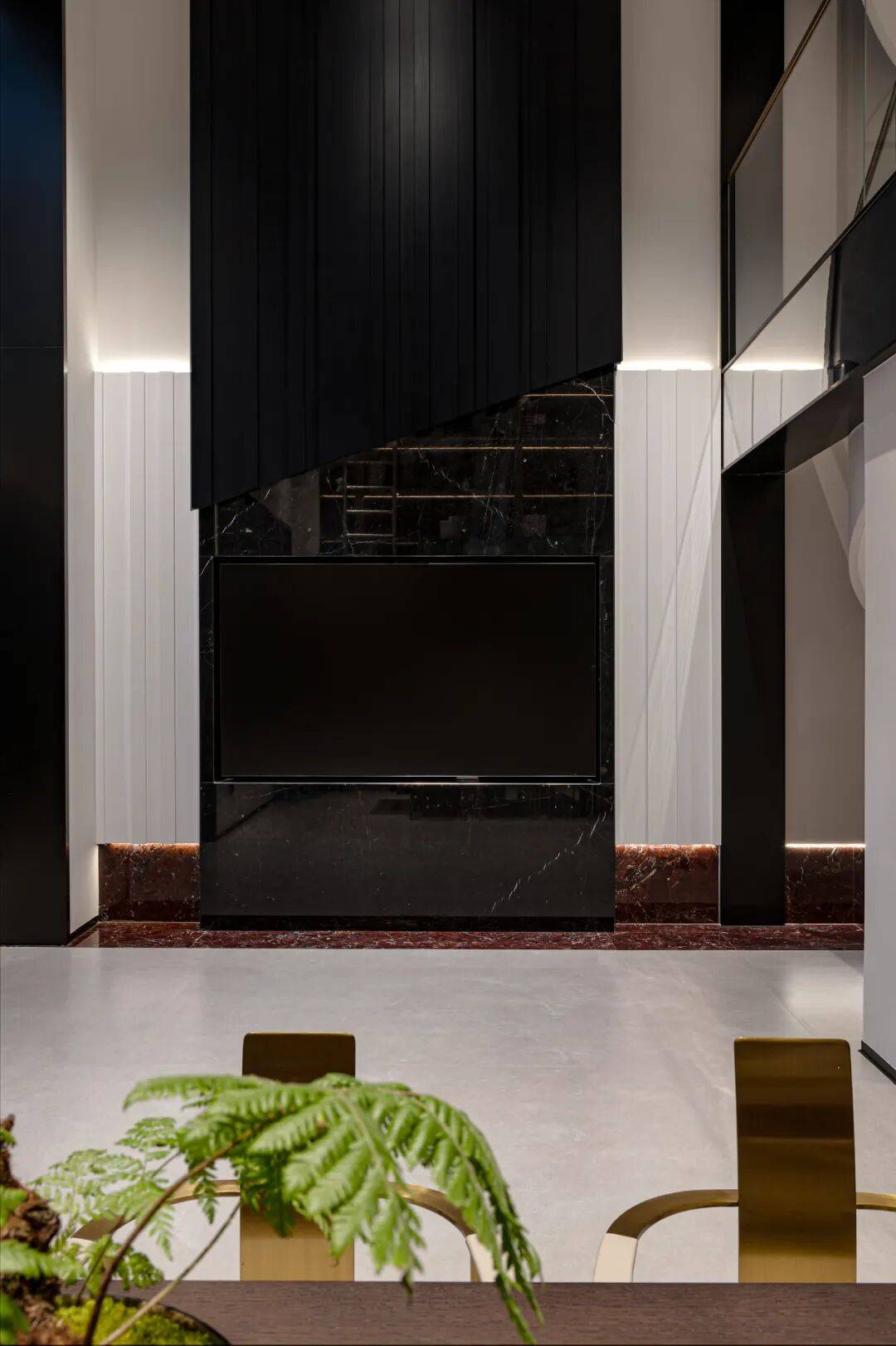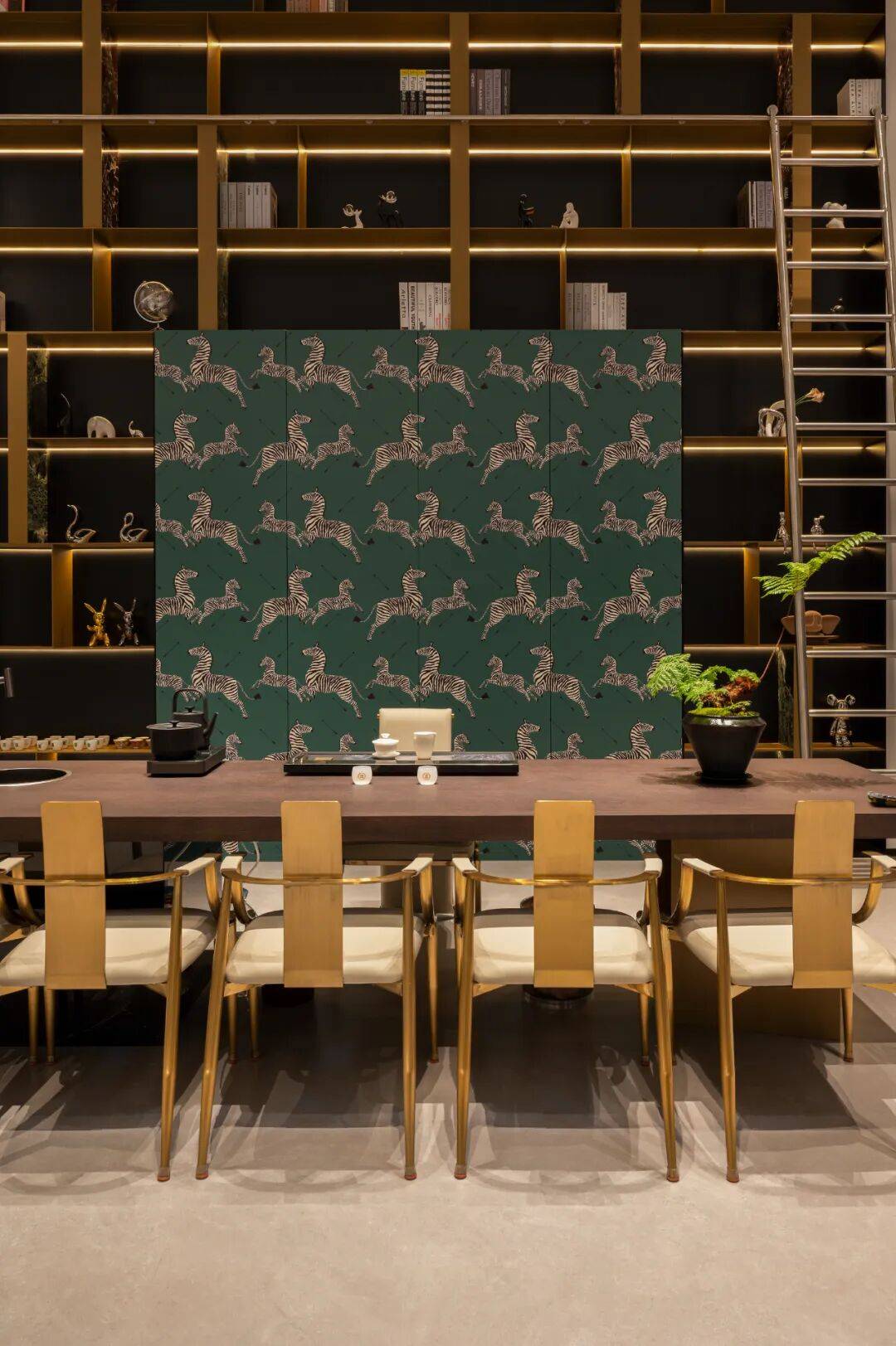 品茗区域 色彩的差异和光感的变化 为空间带来了鲜明的层次感和丰富度 巨幅装饰画 呼应空间色彩的同时 进一步烘托生动活泼的空间氛围 金属的质感与光线的交织将整个空间赋予独特的钝感力 以线条节奏去构建流动的空间感