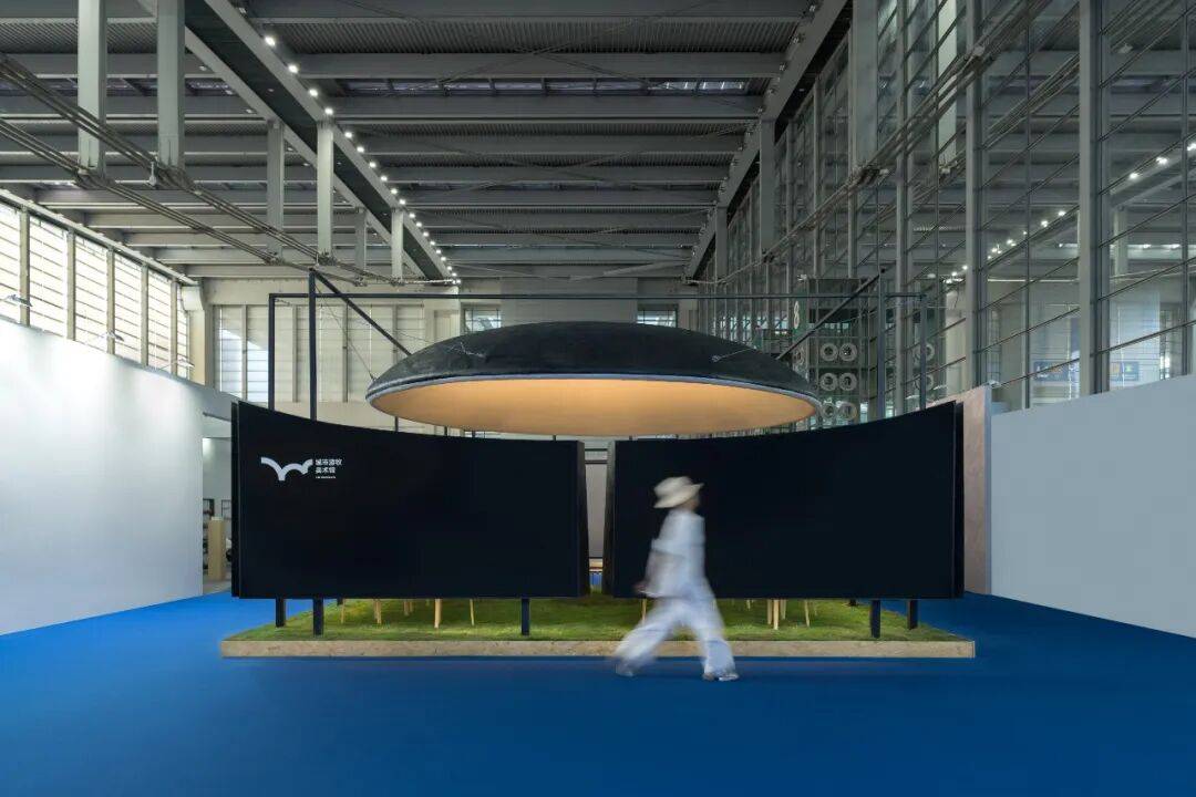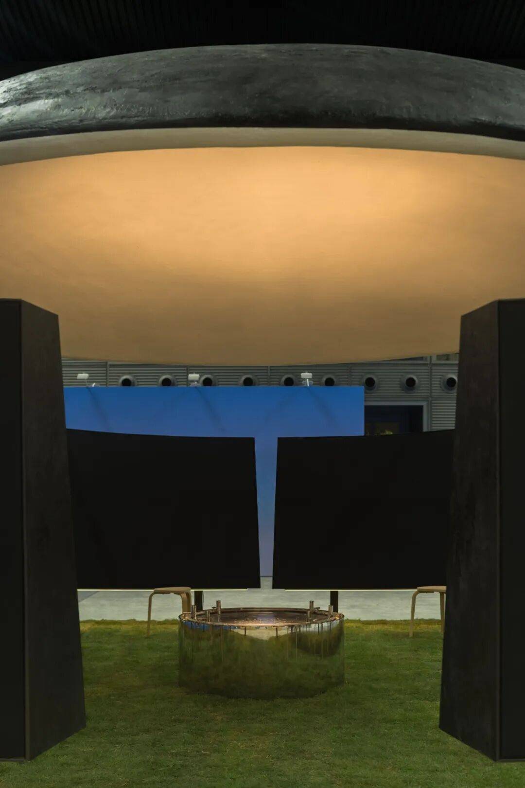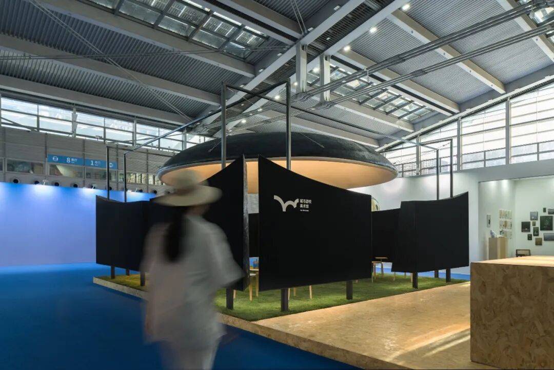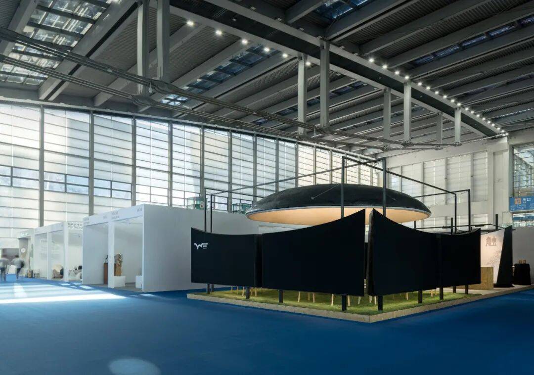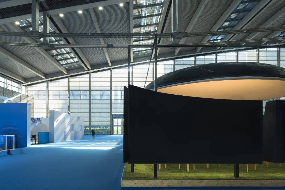 02. 苍穹与边界:空间气质的隐性塑造 穹顶是空间的核心元素,4.5米的高度既无压迫感,也保持适度距离,成为承接光影变化的界面。多片弧形墙体构成"开放的边界",分隔个体位置却不阻断视线,声音与光影的流动,让空间兼具内向凝聚力与公共开放性。整个展位不依赖符号讲述品牌,而是以尺度,节奏与边界关系,塑造出克制,包容的空间气质。