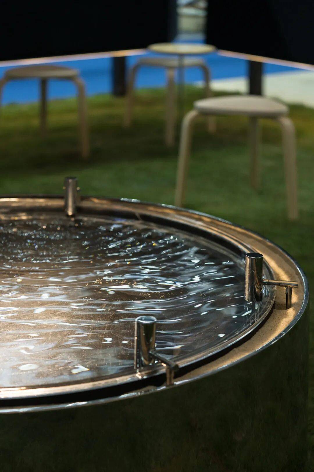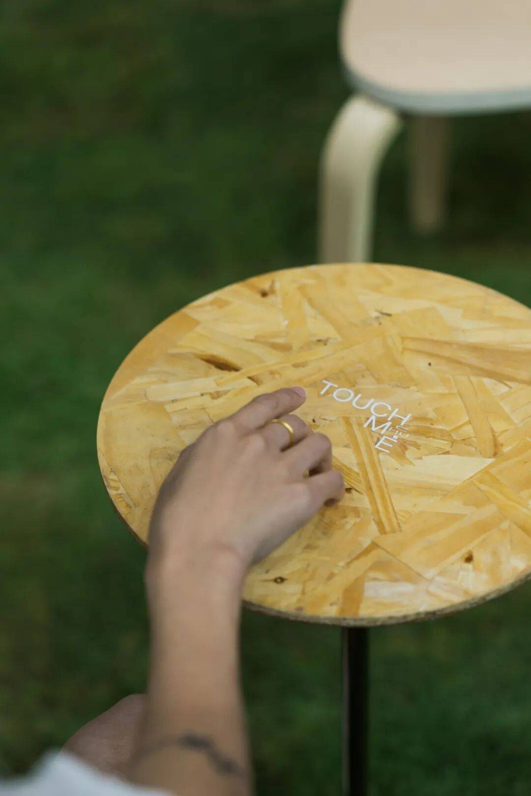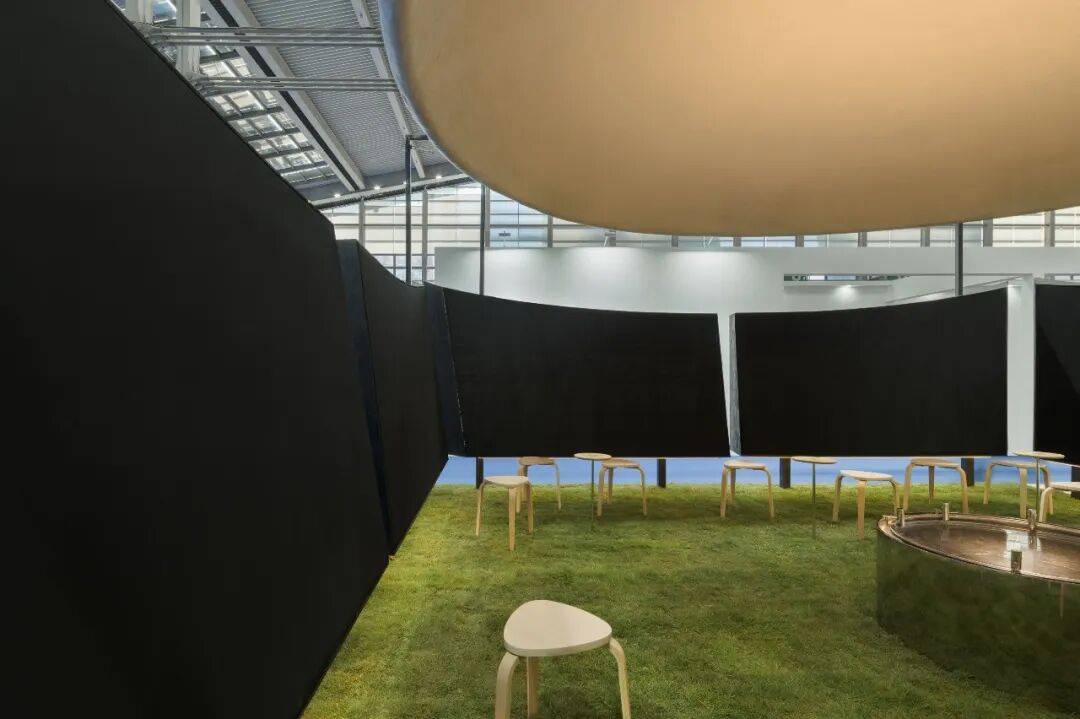 03. 一个被设计用于"停留"的品牌空间 「CHU触」展厅占地约12米x7米,它弱化传统展位的参观路径,着力打造停留型空间。地面铺以草地,低矮木凳环绕中央水池,桌面高度经过反复推敲,引导使用者放松身心。空间中心是可供围坐共享的空场,这种布局让使用者从快速浏览转为停留,观察与交流,延长体验生命周期,让品牌从被动展示转向主动建立情感联结。